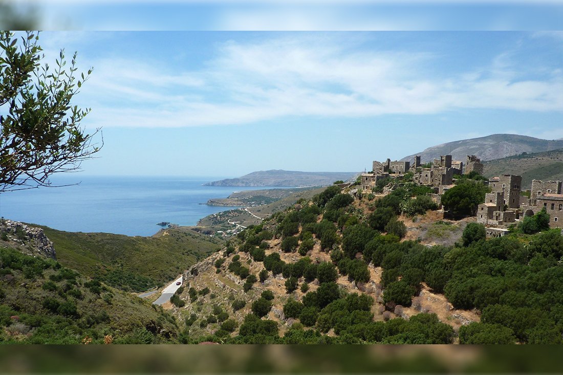 Mevrouw Deuss zag het historische Vathia trots en hoog boven het landschap van Mani uittorenen en legde dit vast op de foto.