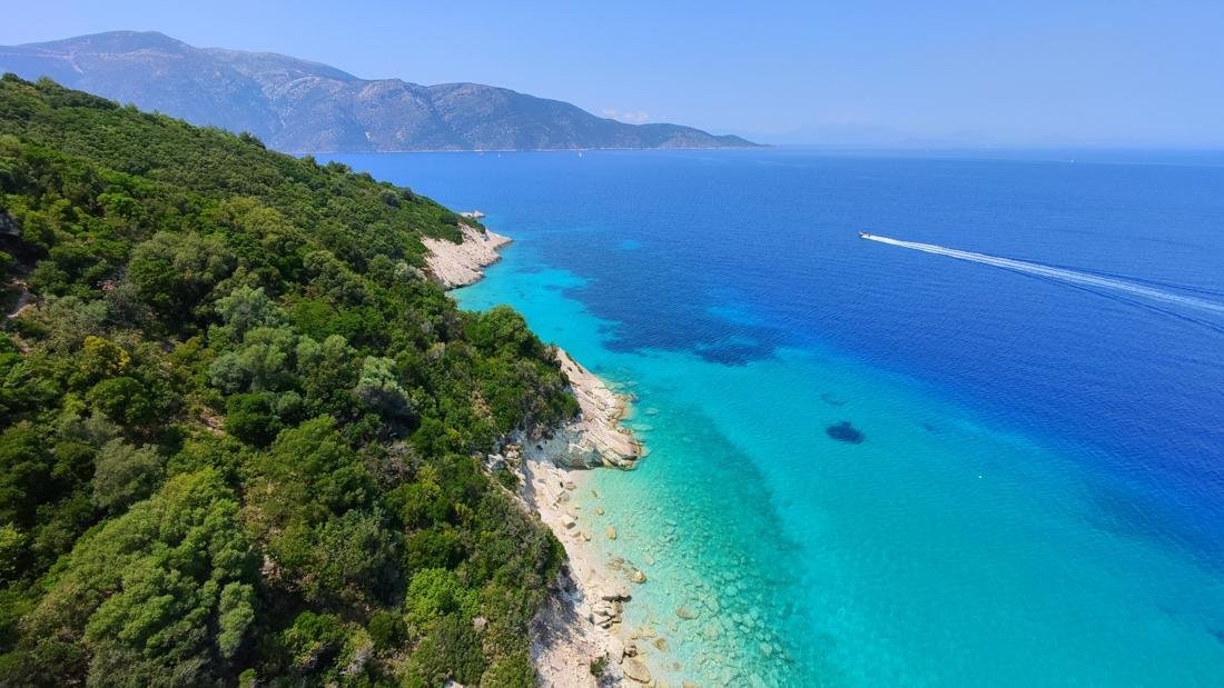 Meneer Beekhuijzen ging op pad met zijn drone, wat schitterende luchtfoto’s opleverde, zoals van de baai van Gidaki Beach, waar het helderblauwe water samengaat met de groene natuur.
