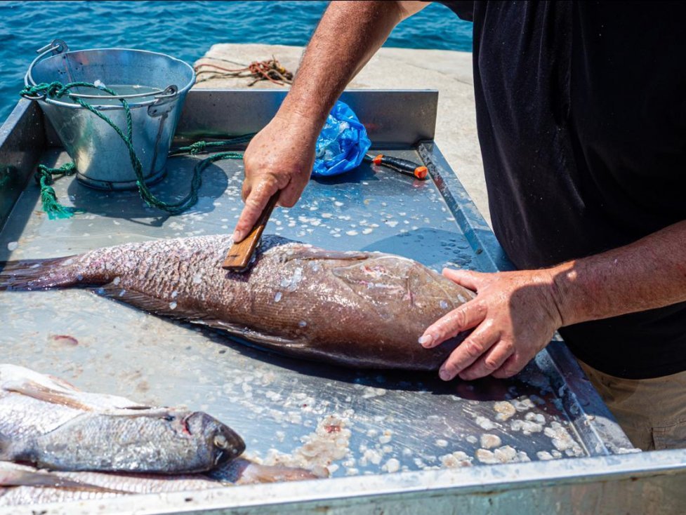 Tijdens haar vakantie op Pilion kwam mevrouw Schumacher langs een tafereel waarin verse vis werd bereid voor de restaurants van Agia Kyriaki.