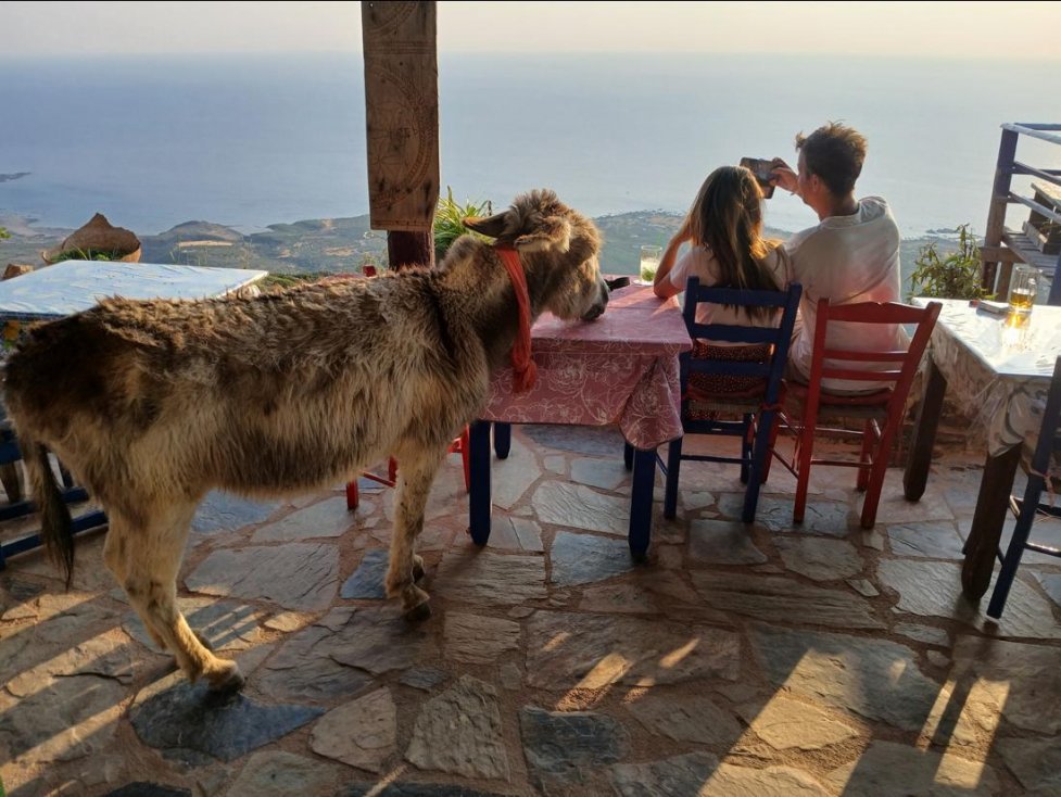 Meneer Pater was onderweg van Paleochora naar Livadia toen hij even stopte voor een verfrissend drankje. Daar ontmoette hij de vriendelijke ezel Petroula.