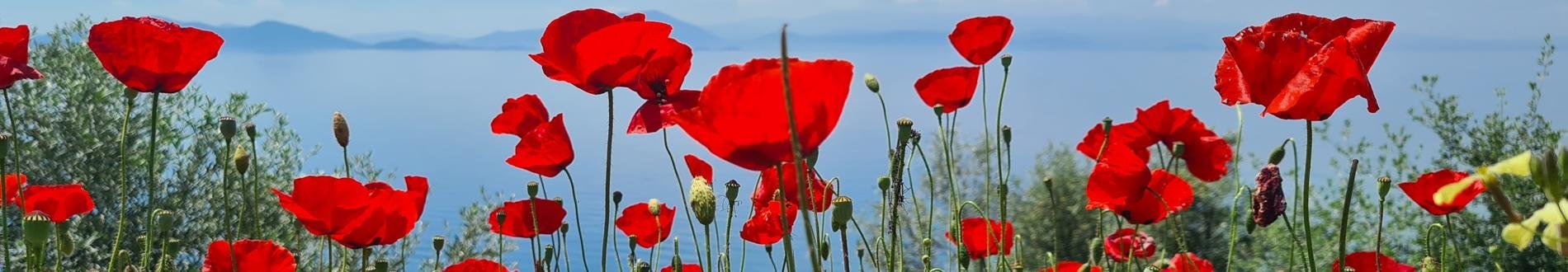 Met als contrast de blauwe zee op de achtergrond maakte mevrouw Hoogeveen tijdens haar vakantie in Afissos een foto van deze felrode klaprozen.