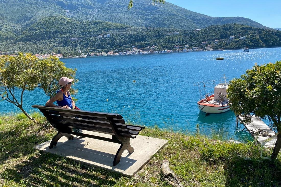 Tijdens een wandeling op Ithaki fotografeerde mijnheer Visser zijn reisgenote terwijl zij even de omgeving op zich in liet werken.