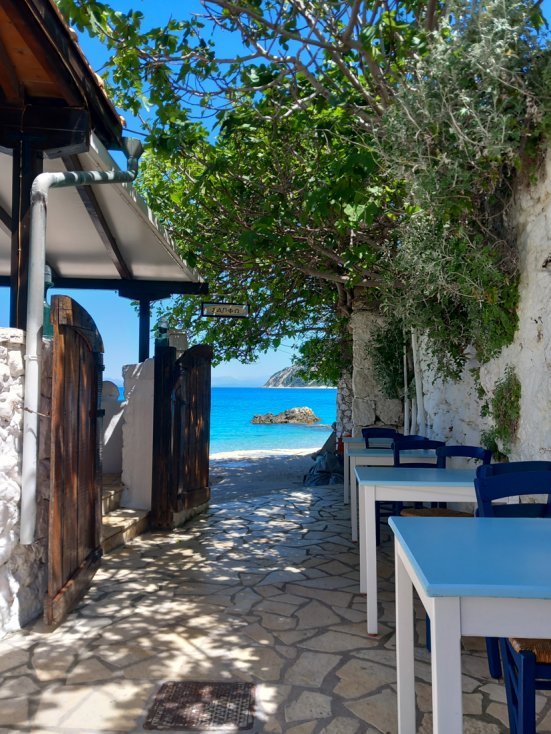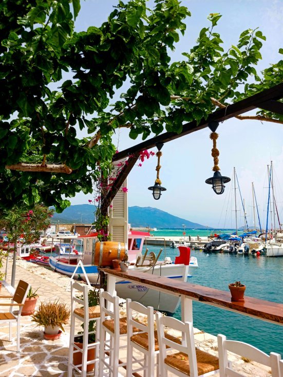Tijdens haar vakantie op Samos schoof mevrouw Bakker graag aan bij dit mooie plekje aan de haven van Ormos.
