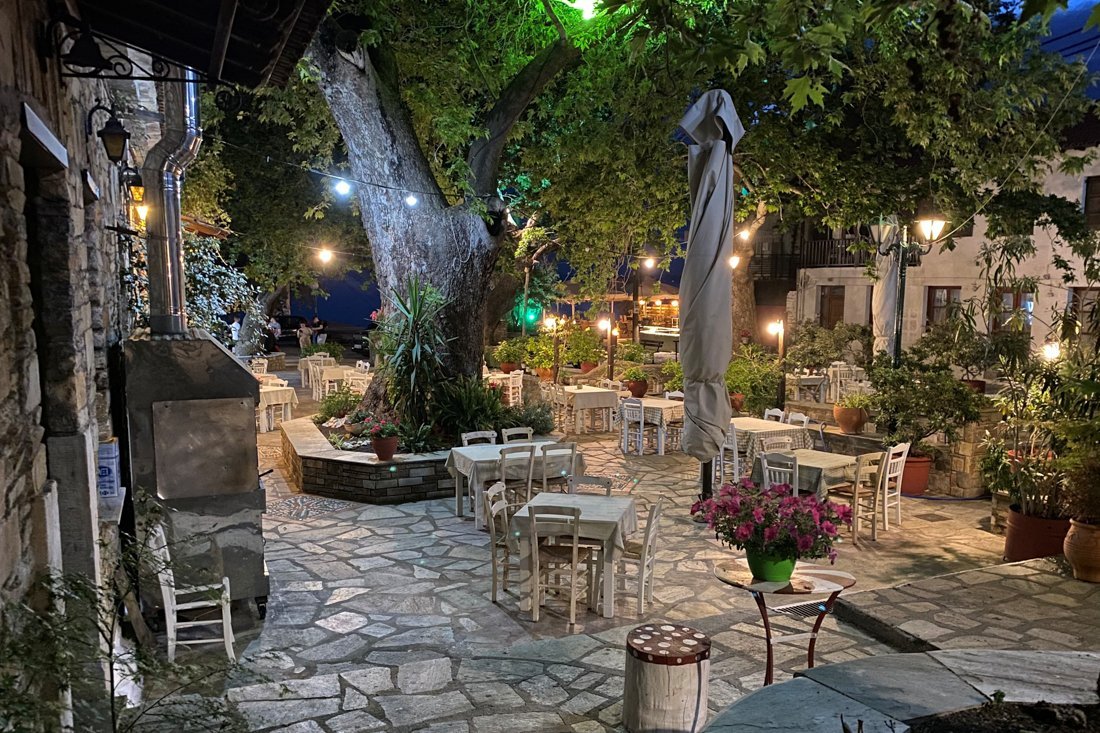 Mevrouw van der Laan-Wieringa beleefde tijdens haar vakantie op Pilion vele mooie momenten op het gezellige dorpsplein van Afissos.