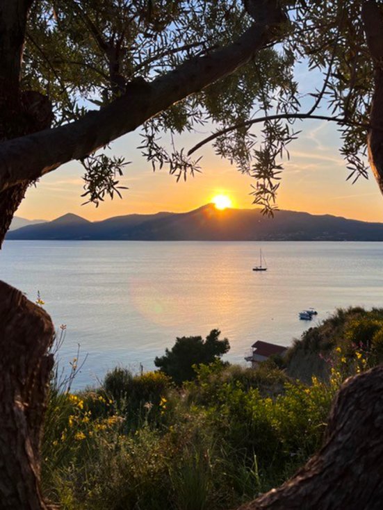 Liggend in de tuin van Kanellos Appartemementen de zon in zee zien zakken, was voor mevrouw de Wijs een van de vele hoogtepunten van haar vakantie in Akarnania.