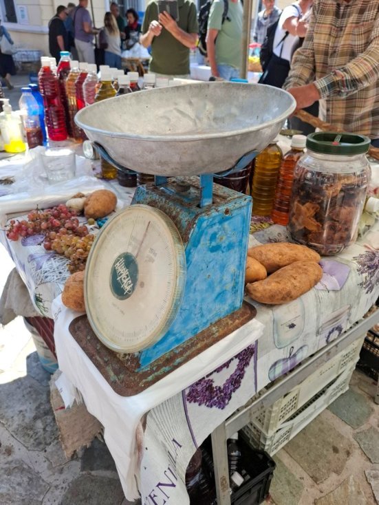 Op de markt in Potamos viel het oog van mevrouw Van der Donk op een oude weegschaal, nog altijd volop in gebruik. Een mooi symbool van evenwicht tussen oud en nieuw.