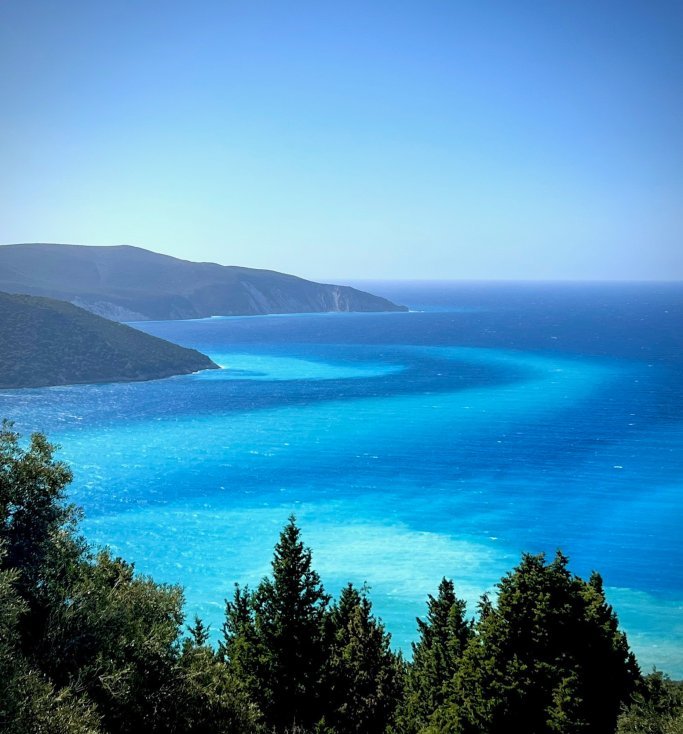 Tijdens haar rit over Kefalonia stuitte mevrouw Vermeulen op dit mooie uitzicht, waarbij de zee een spel speelt met de verschillende tinten blauw.