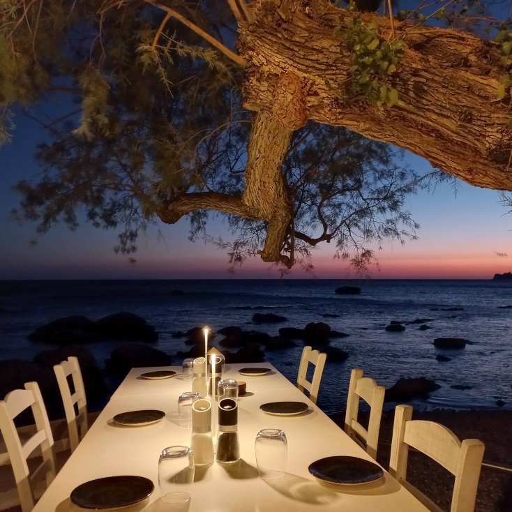 Met de zon die net in zee was gezakt, de laatste kleuren aan de horizon en een tafeltje aan het water, legde mevrouw Van Leeuwen tijdens haar vakantie in Plakias dit schilderachtige moment vast.