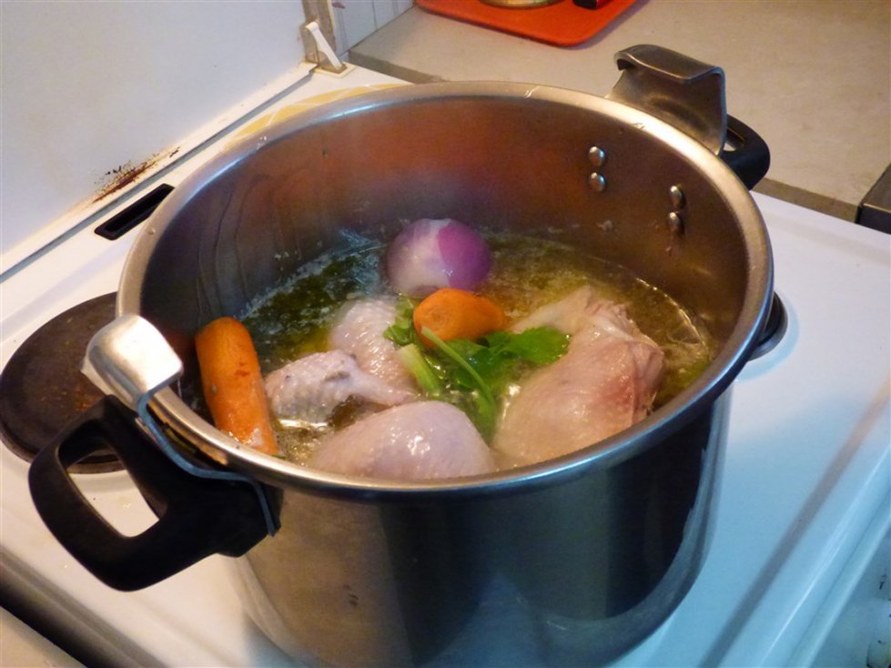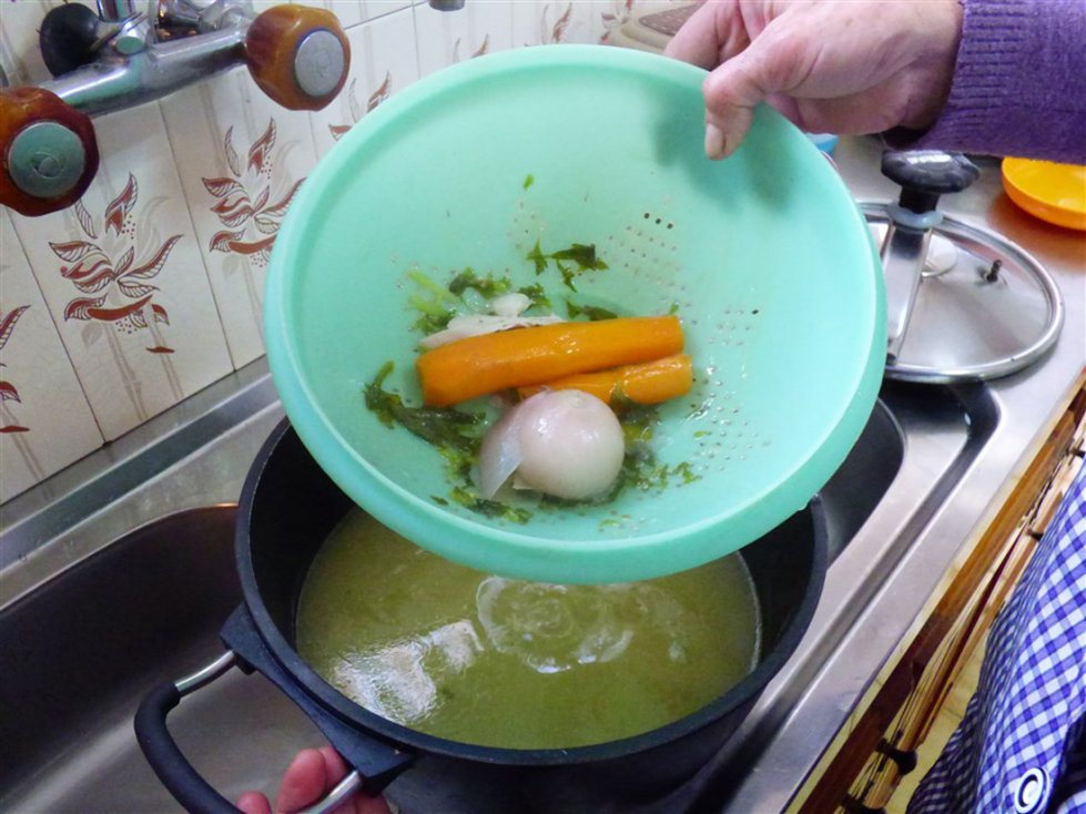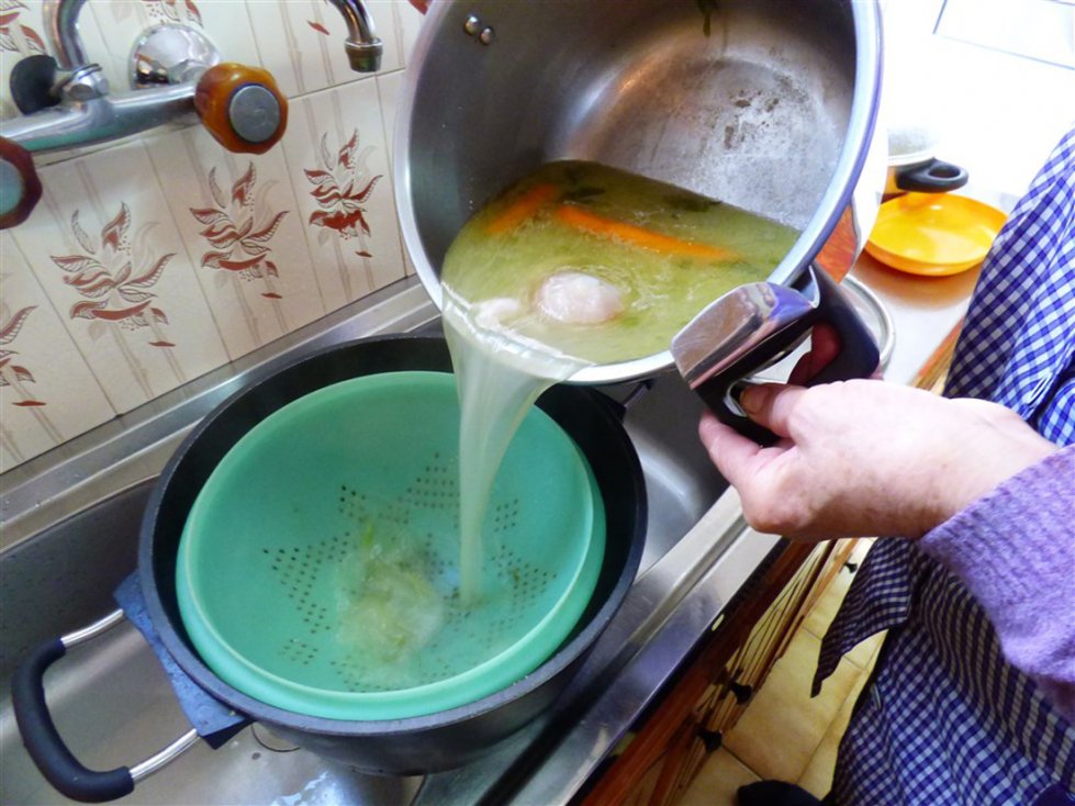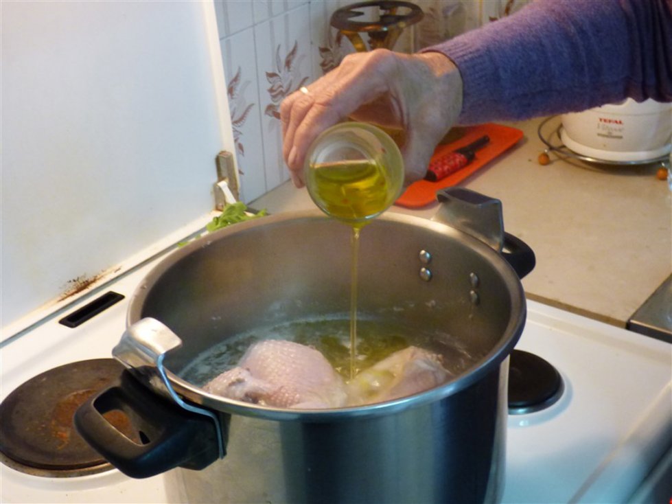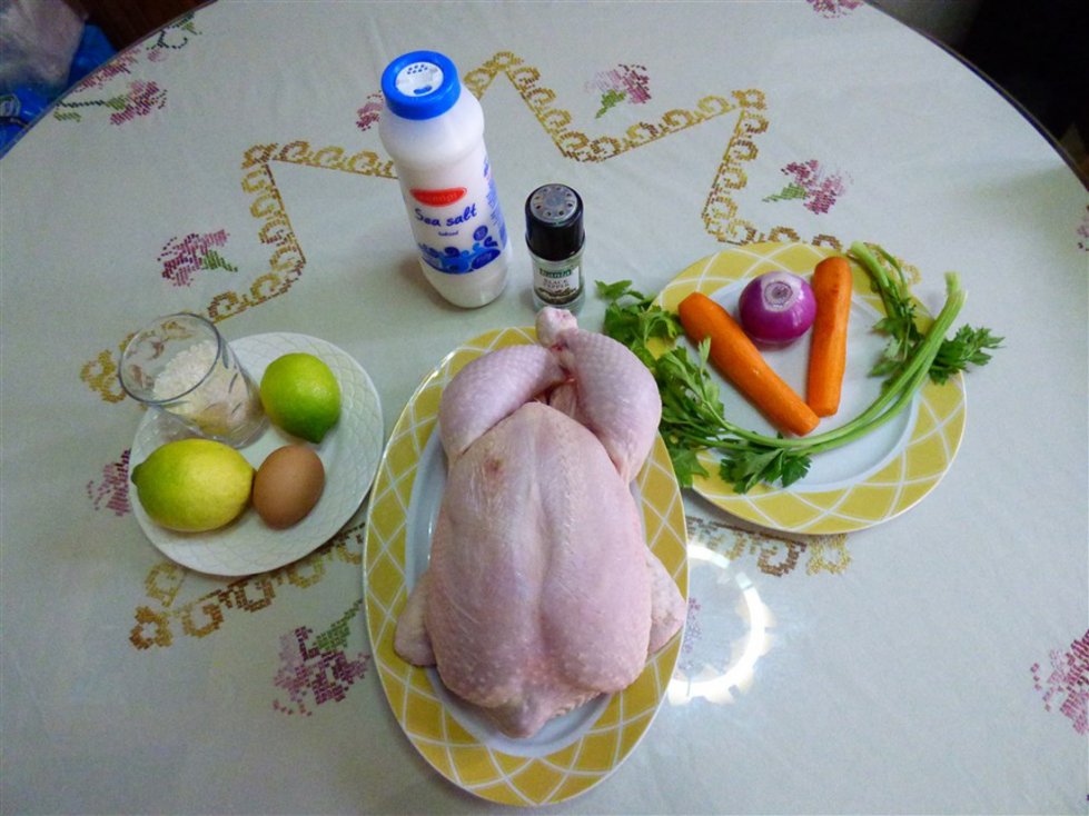 Was de kip, snijd deze in stukken en leg de stukken in een pan. Vul de pan met water en zet hem op het vuur. Schuim de oppervlakte af als het water begint te koken. Dan worden de olijfolie, selderij, ui en wortels erbij gedaan, laat dit op middelhoog vuur doorkoken. Laat het zachtjes sudderen totdat de kip gaar is. Haal dan de kip eruit en leg deze apart. Zeef de soep in een nieuwe pan, zodat de groenten hiervan gescheiden worden. Breng de soep opnieuw aan de kook terwijl de rijst wordt toegevoegd en laat het circa tien minuten koken totdat de rijst gaar is. We halen de pan van het vuur en beginnen aan de ei-citroen saus.