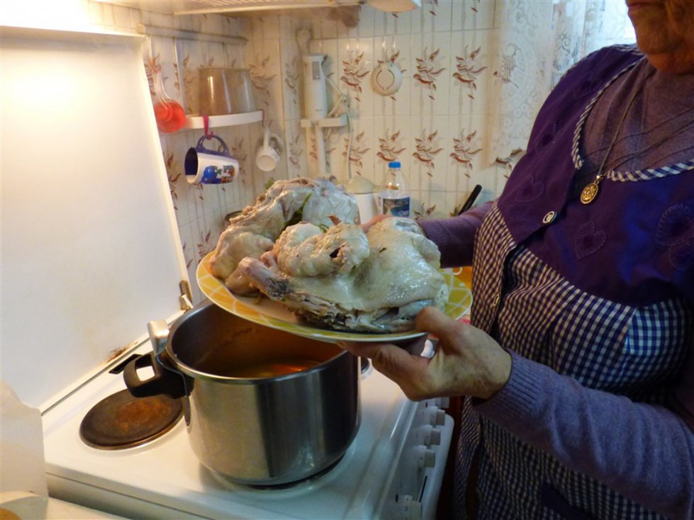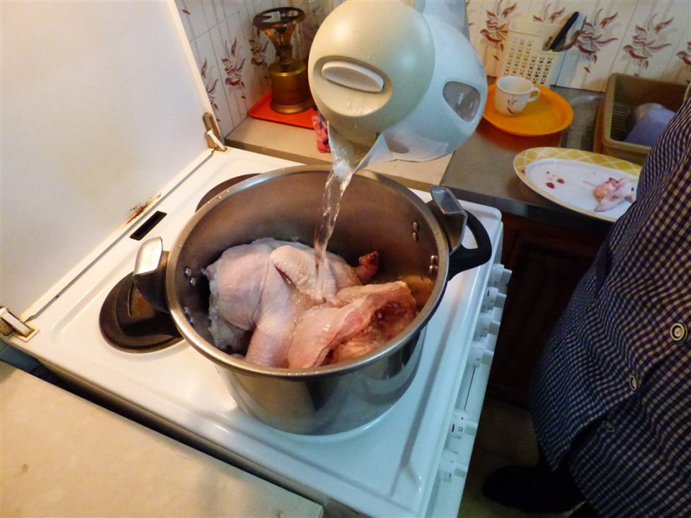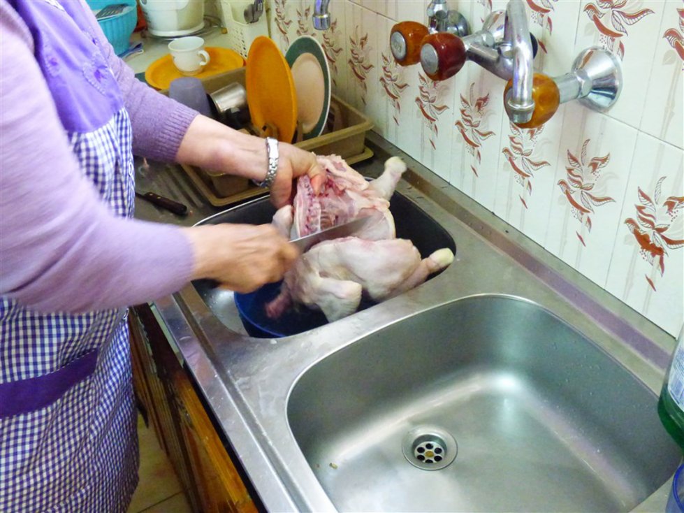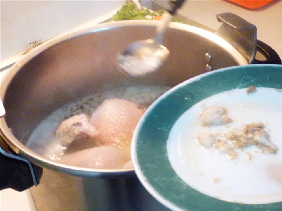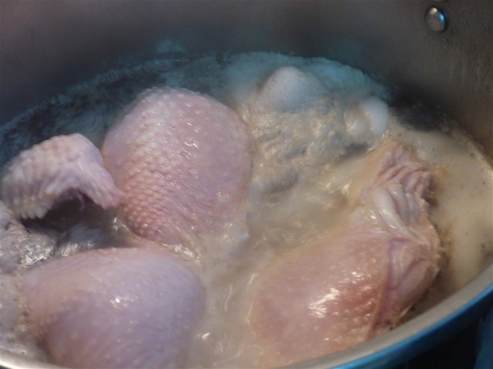 Was de kip, snijd deze in stukken en leg de stukken in een pan. Vul de pan met water en zet hem op het vuur. Schuim de oppervlakte af als het water begint te koken. Dan worden de olijfolie, selderij, ui en wortels erbij gedaan, laat dit op middelhoog vuur doorkoken. Laat het zachtjes sudderen totdat de kip gaar is. Haal dan de kip eruit en leg deze apart. Zeef de soep in een nieuwe pan, zodat de groenten hiervan gescheiden worden. Breng de soep opnieuw aan de kook terwijl de rijst wordt toegevoegd en laat het circa tien minuten koken totdat de rijst gaar is. We halen de pan van het vuur en beginnen aan de ei-citroen saus.
