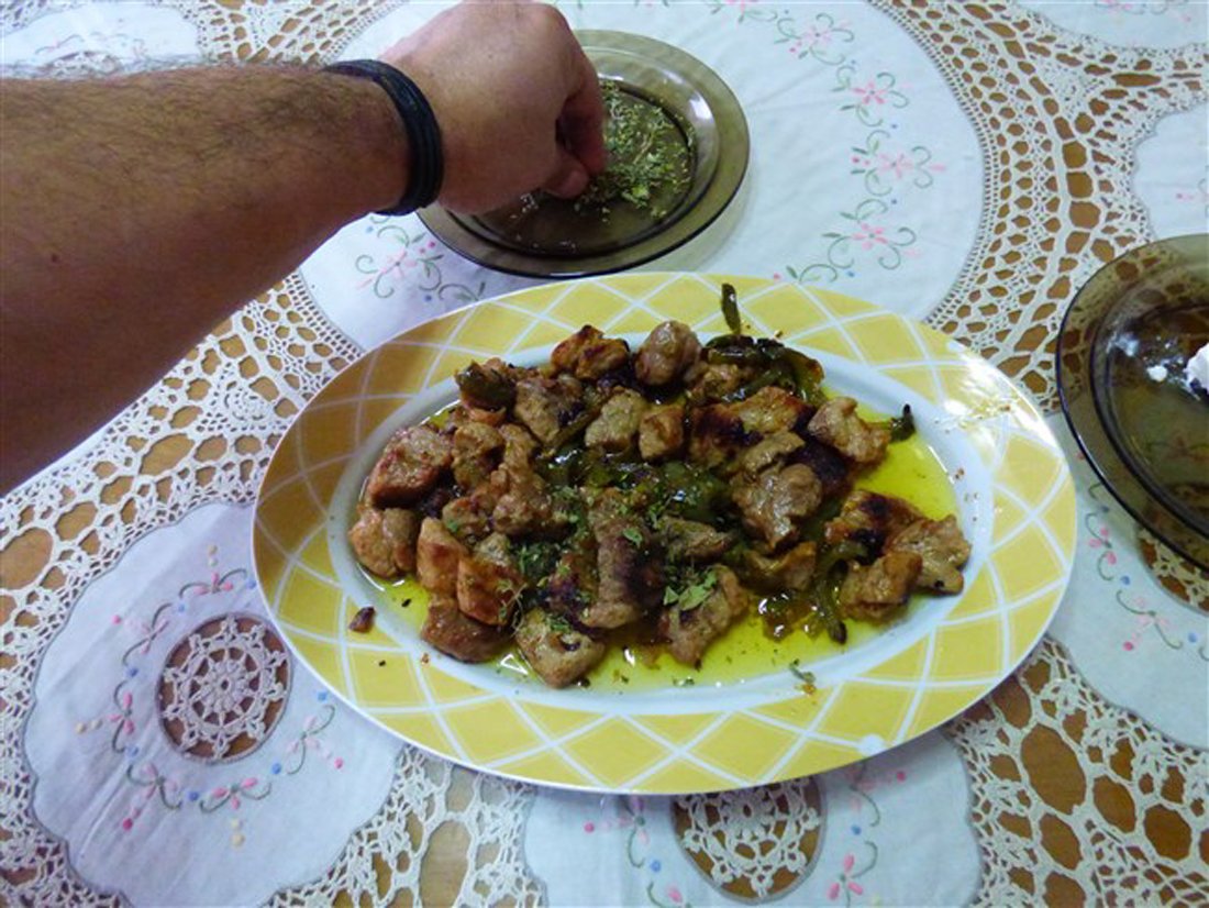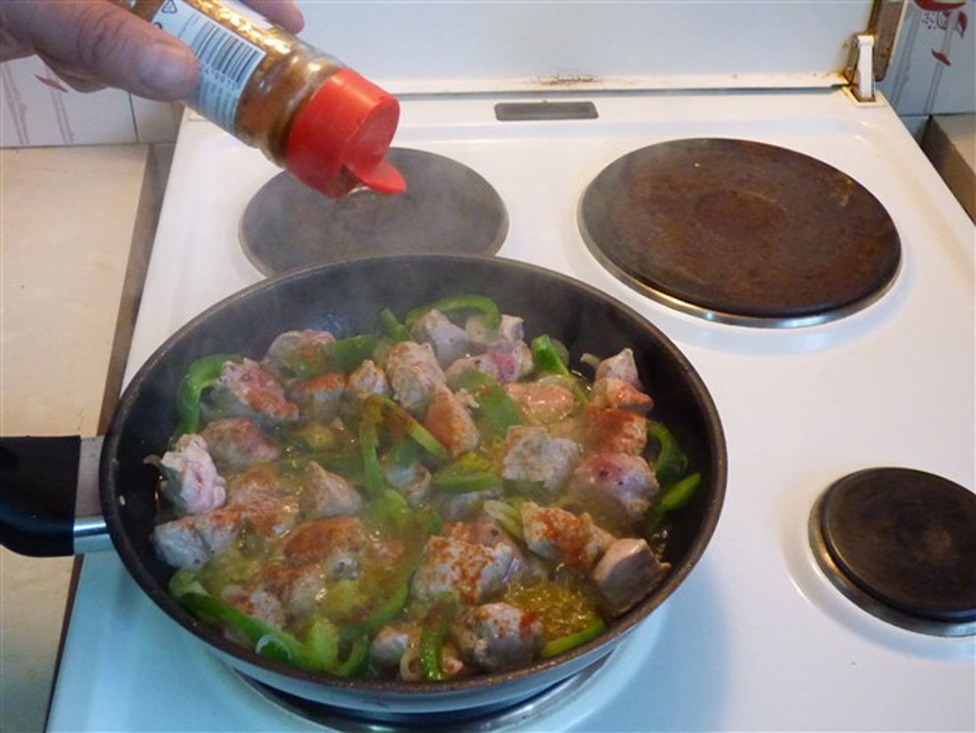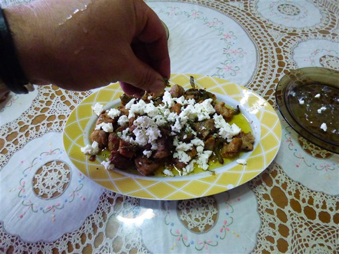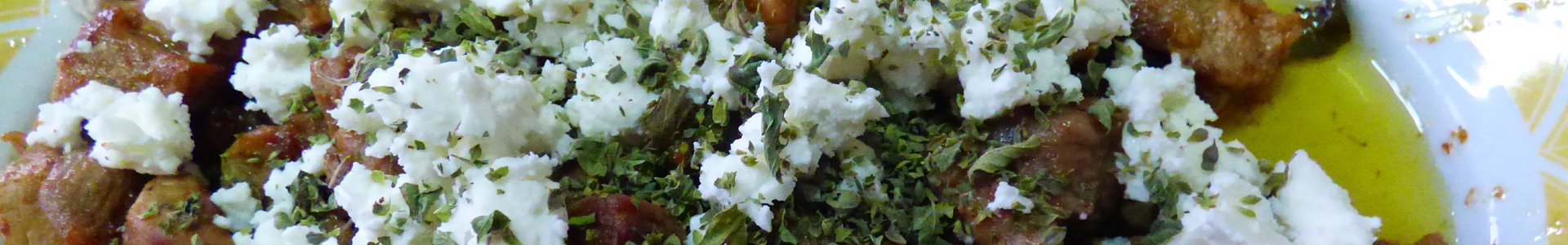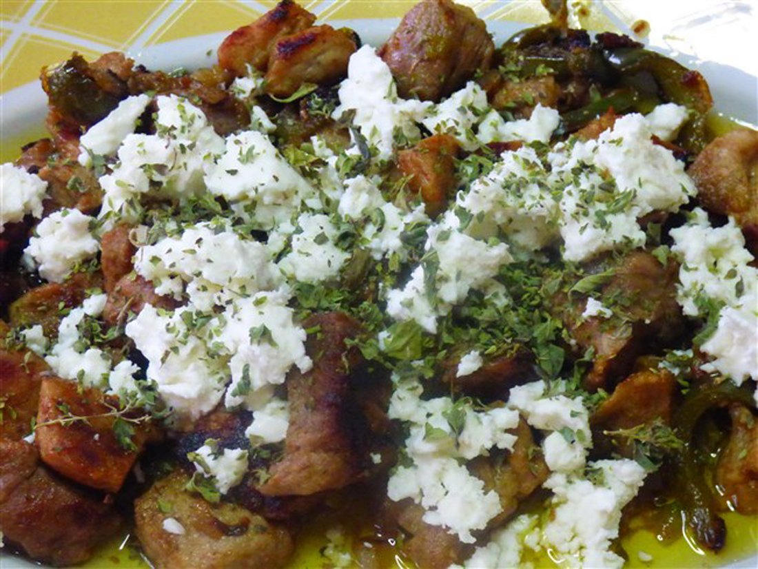 Snij het varkensvlees, de ui en de paprika en bak alles 10 minuten in olijfolie in de pan. Strooi zout, peper en veel chilipoeder over het geheel en voeg daarna de wijn toe en zet het vuur lager. Laat het ongeveer 20 minuten doorkoken en roer het af en toe door totdat het meeste vocht verdampt is. Schep het geheel op een bord en strooi er oregano overheen. Wacht altijd met het toevoegen van oregano totdat het eten van het vuur af is omdat de oregano olie anders verbrand en het eten bitter maakt. Verdeel daarna de feta over het bord door het met je handen te breken. Strooi er ten slotte nog wat extra oregano overheen.