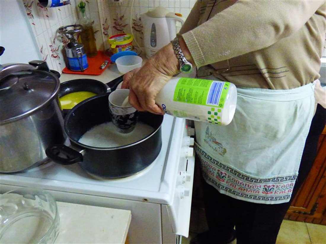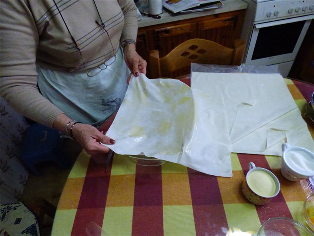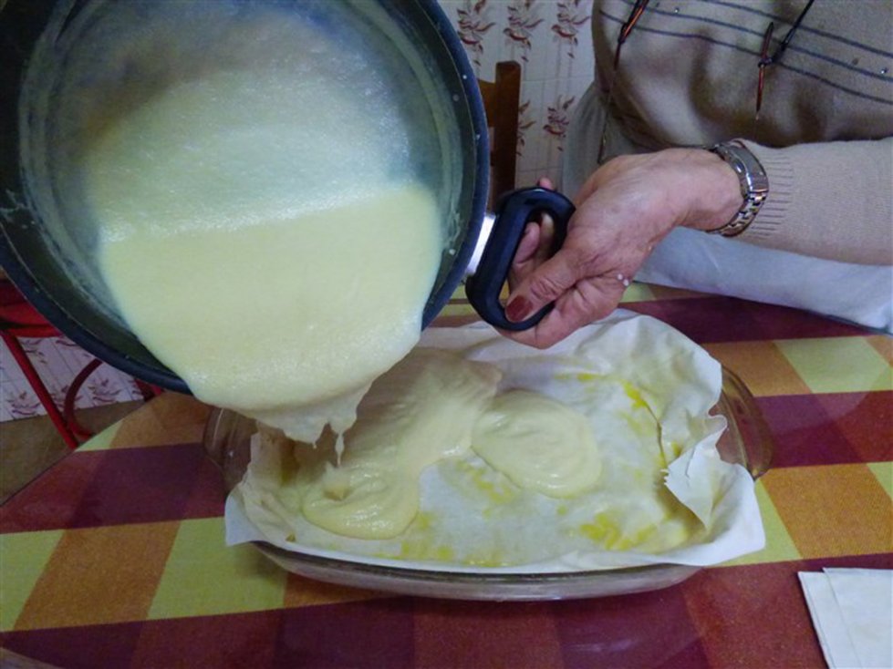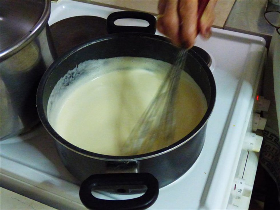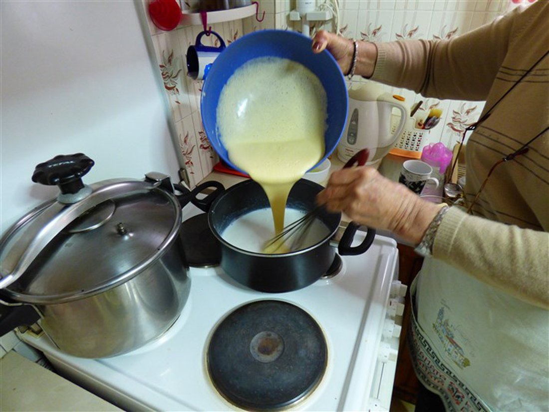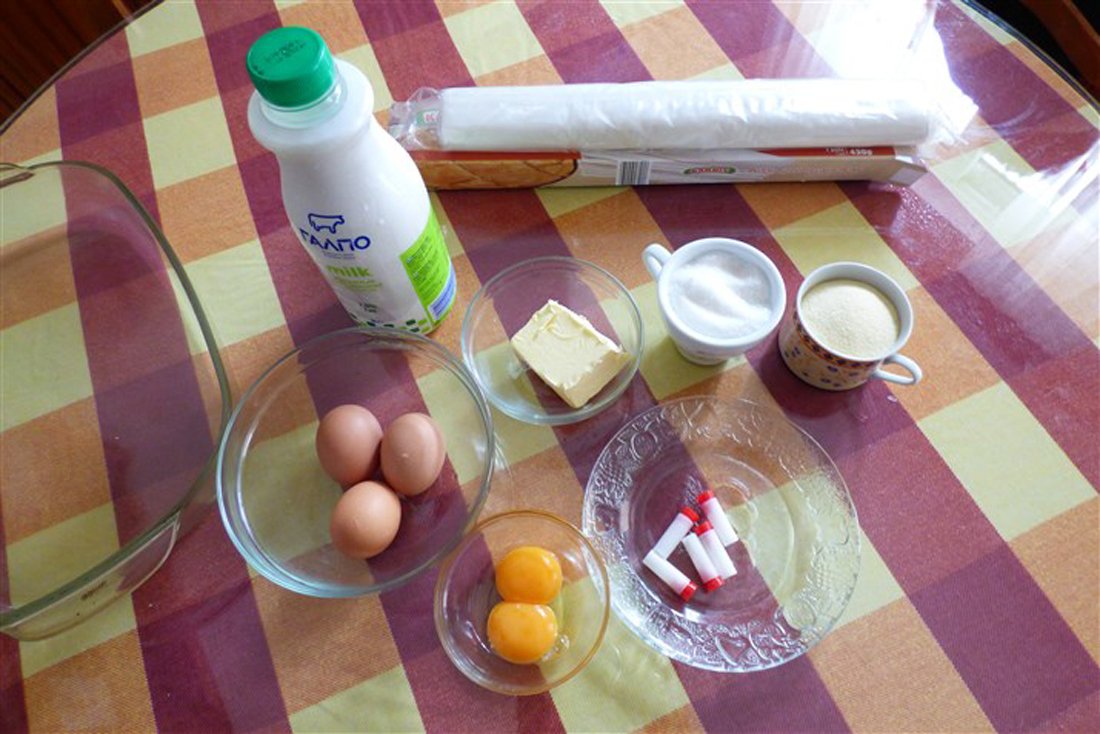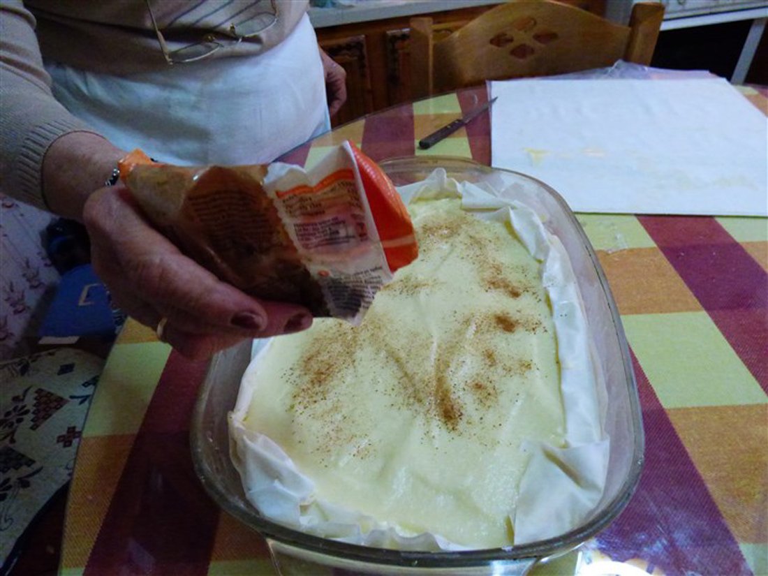Giet vervolgens de melk in een pan en laat het zachtjes koken. Doe de eieren en de eidooiers in een kom en voeg hieraan de suiker toe. Voeg ook de griesmeel toe en klop het geheel. Mix het vervolgens verder in een grote kom en voeg tijdens het mixen de vanillesuiker toe. In Griekenland gebruikt men hiervoor buisjes vanillesuiker, wat in Nederland ongeveer gelijk staat aan een zakje vanillesuiker. Haal de pan met melk van het vuur en doe het mengsel bij de melk. Zet de pan daarna op middelhoog vuur en roer totdat er een dik, romig mengsel is ontstaan. Giet dit vervolgens over de bodem van filodeeg in de ovenschaal. Doe er een klein beetje kaneel bij.