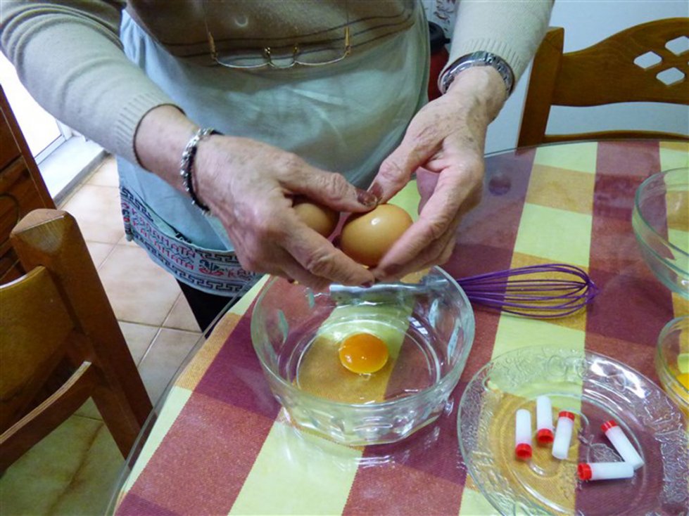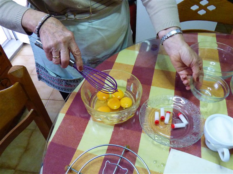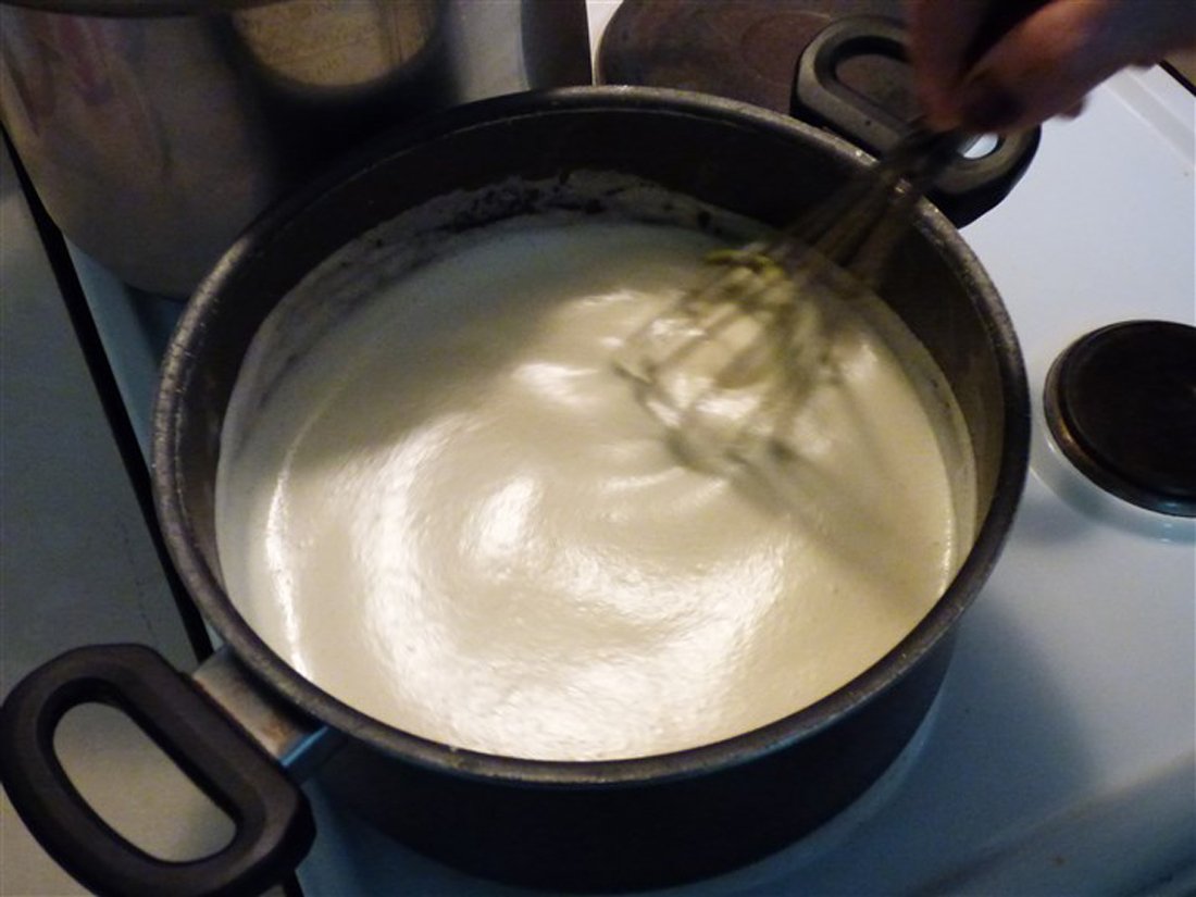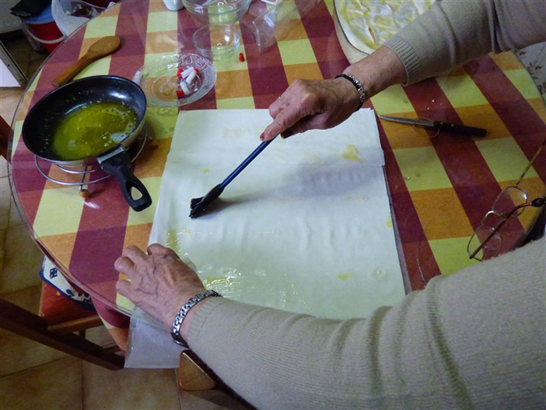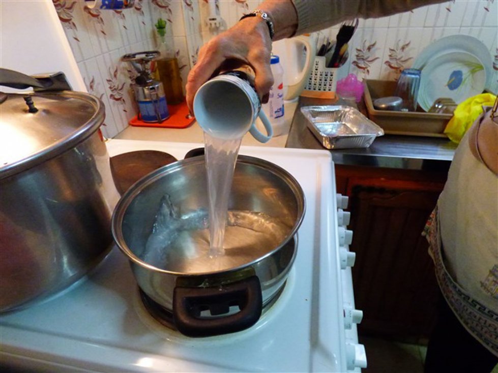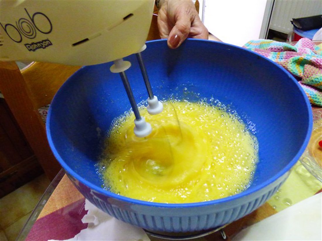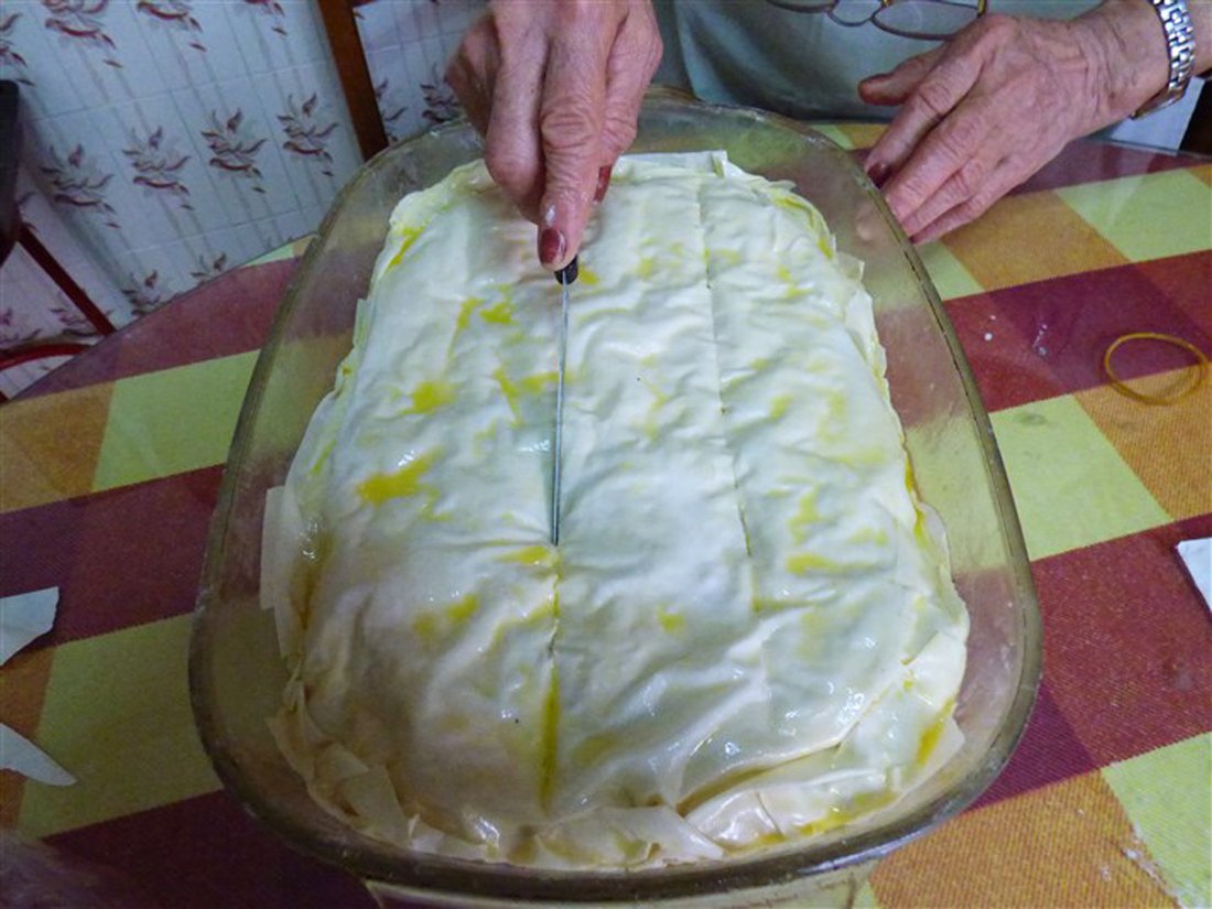 Giet vervolgens de melk in een pan en laat het zachtjes koken. Doe de eieren en de eidooiers in een kom en voeg hieraan de suiker toe. Voeg ook de griesmeel toe en klop het geheel. Mix het vervolgens verder in een grote kom en voeg tijdens het mixen de vanillesuiker toe. In Griekenland gebruikt men hiervoor buisjes vanillesuiker, wat in Nederland ongeveer gelijk staat aan een zakje vanillesuiker. Haal de pan met melk van het vuur en doe het mengsel bij de melk. Zet de pan daarna op middelhoog vuur en roer totdat er een dik, romig mengsel is ontstaan. Giet dit vervolgens over de bodem van filodeeg in de ovenschaal. Doe er een klein beetje kaneel bij.