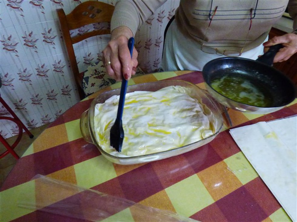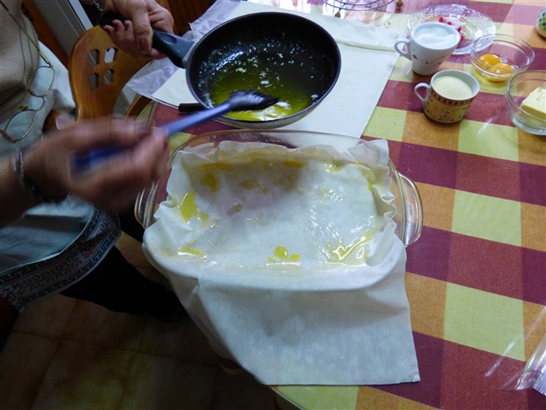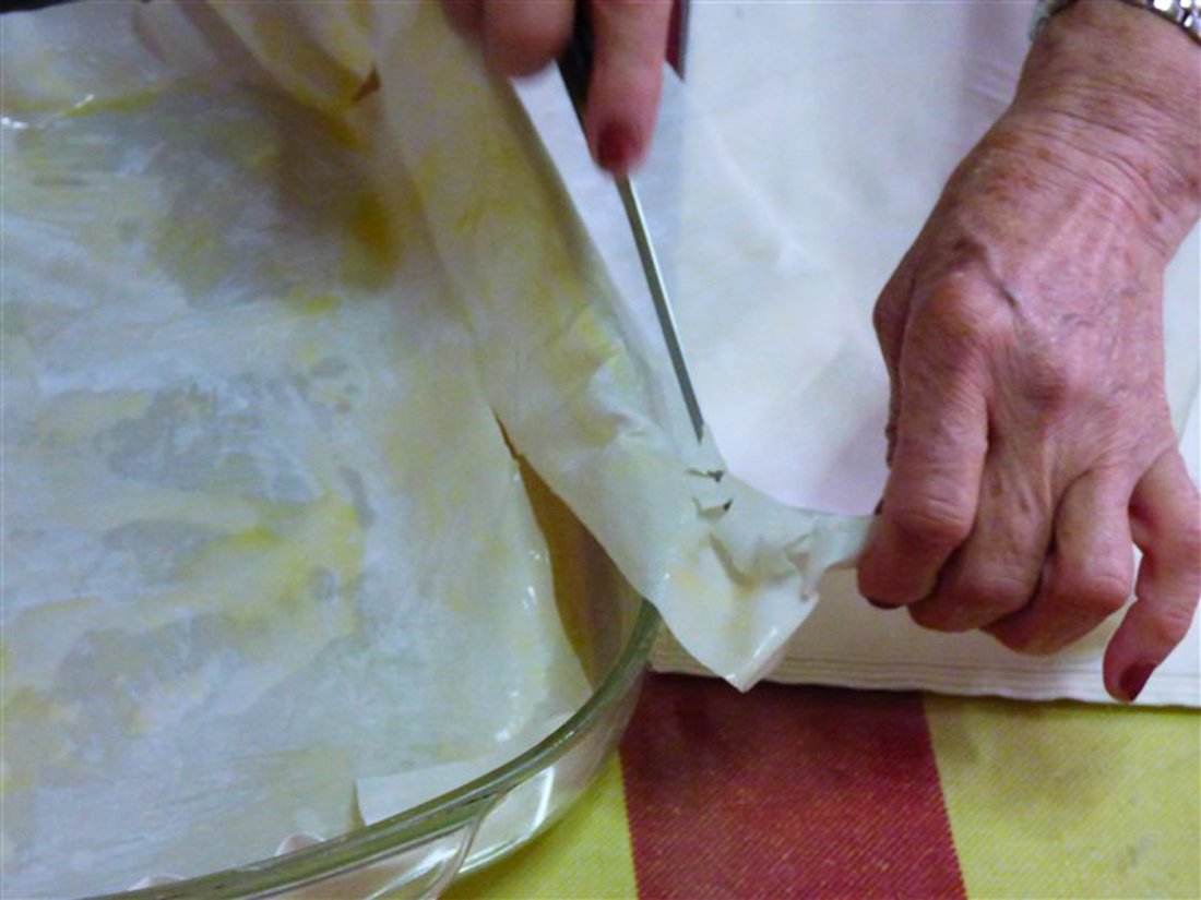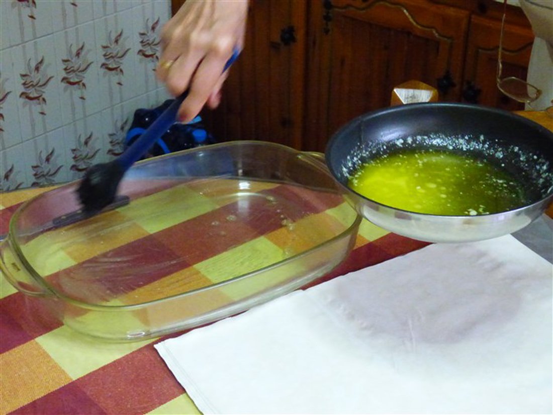 Smelt wat boter in een pan en vet hiermee de ovenschaal in. Spreid het filodeeg uit en vet de eerste laag in met de gesmolten boter. Leg het vervolgens in de ovenschaal en snijd het overtollige deeg weg. Vet nog drie lagen filodeeg in en leg deze een voor een in de ovenschaal, zodat u een bodem van vier lagen deeg heeft.