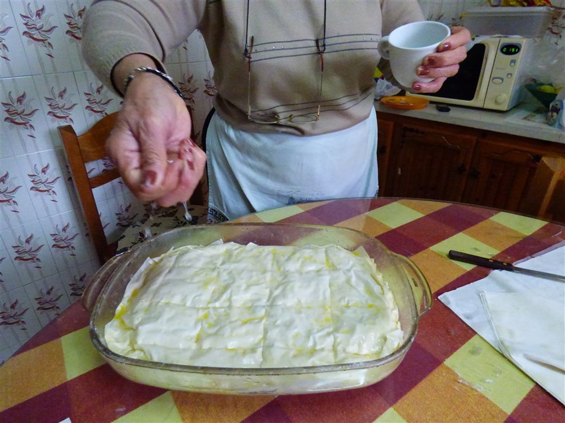 Vet opnieuw vier lagen filodeeg een voor een in met wat gesmolten boter en bedek hiermee het mengsel in de ovenschaal. Smeer ook nog wat boter op de bovenste laag. Snijd vervolgens met een mes in het deeg zodat er vierkanten ontstaan. Let hierbij op dat u alleen licht in de bovenkant snijd. Sprenkel er daarna wat water op en zet de schaal in de oven bij 190 graden. De galaktoboúreko is klaar wanneer hij een mooie goudbruine kleur heeft.