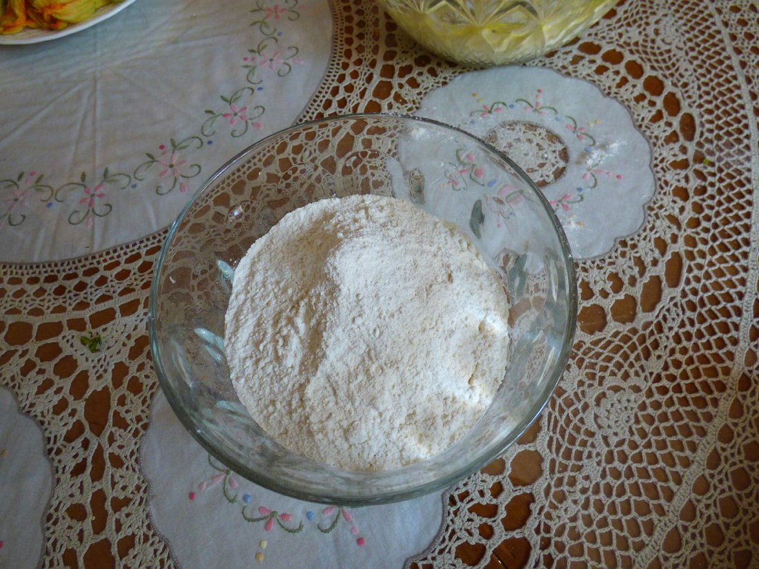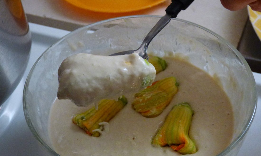 Open nu de courgettebloem en vul deze met het kaasmengsel, ongeveer twee eetlepels is voldoende. Vouw daarna de bloem dicht en doop deze in het tweede mengsel zodat de hele bloem hier ruim mee bedekt is.