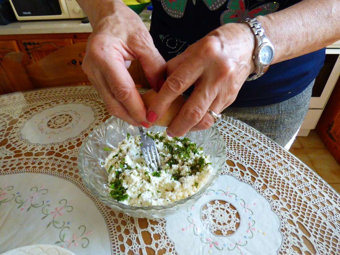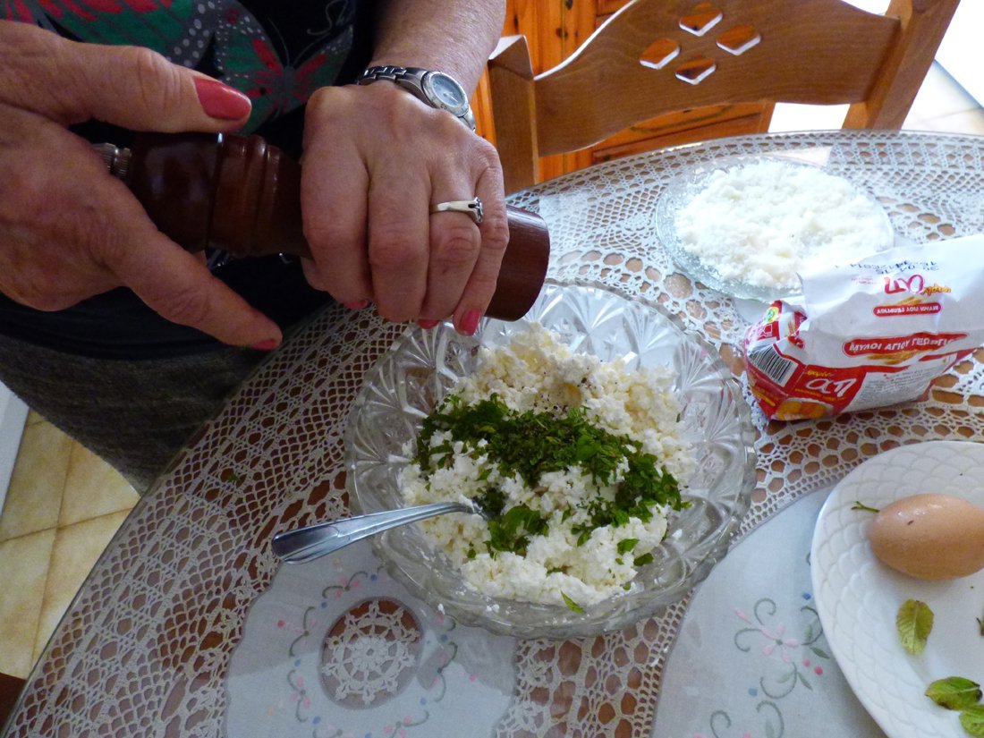 Eerst maken we het kaasmengsel voor de vulling van de bloemen. Verkruimel de feta met een vork in een schaal en giet er, tijdens het verkruimelen, een klein kopje melk bij. Voeg vervolgens de Parmezaanse/Goudse kaas, gesneden groene muntblaadjes, ei en peper toe. Roer dit mengsel goed door elkaar.