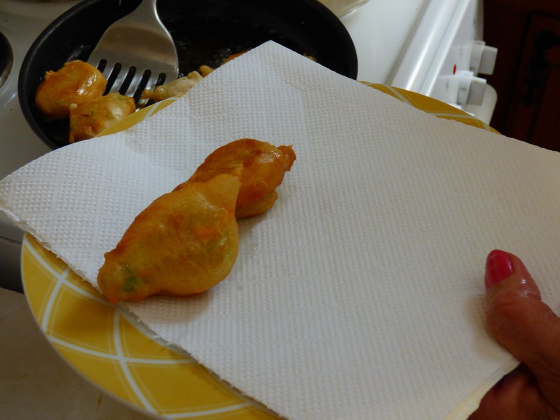 Zet een pan met daarin de maïsolie op een hoog vuur. Als de maïsolie heet is, gaat het vuur op middelhoog en beginnen we met het frituren van de courgettebloemen. Als de buitenkant goudbruin kleurt kunnen ze uit de olie gehaald worden.