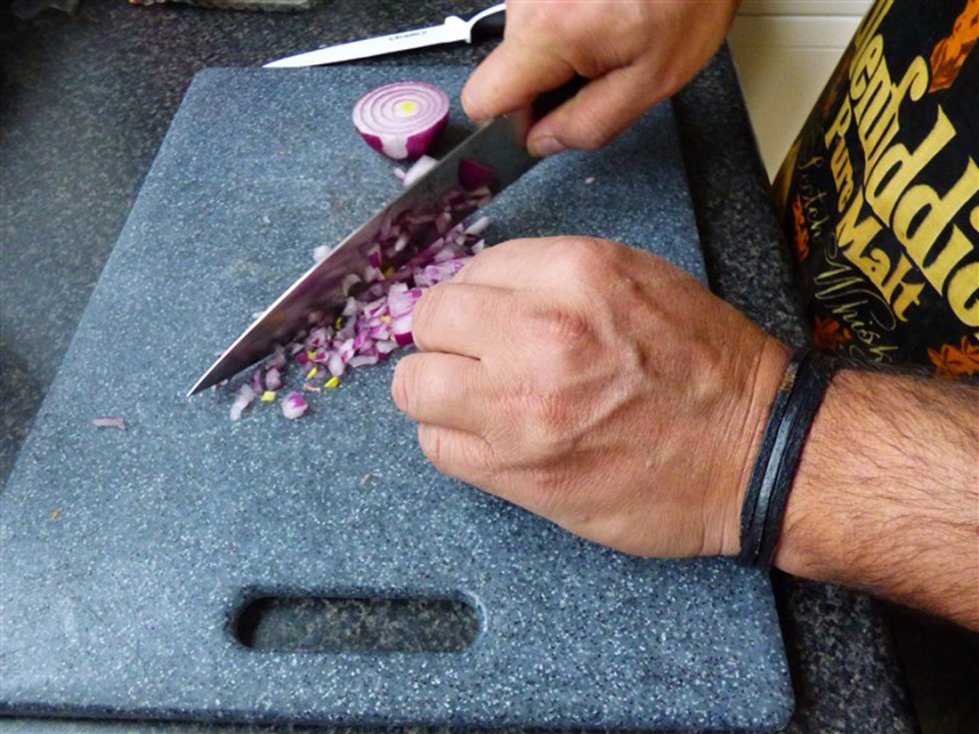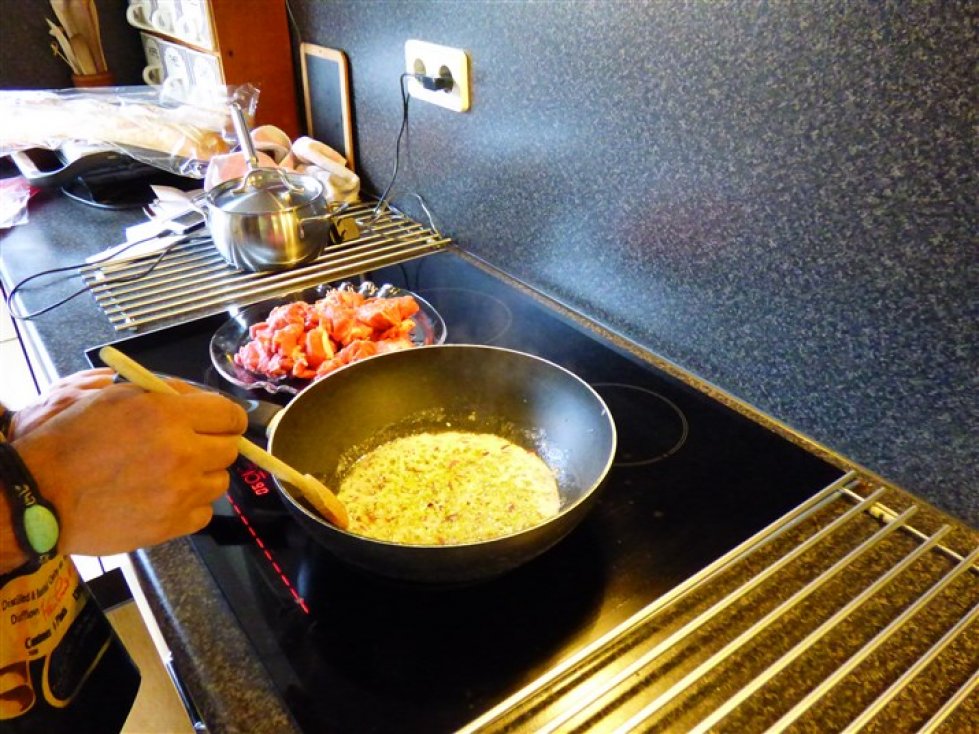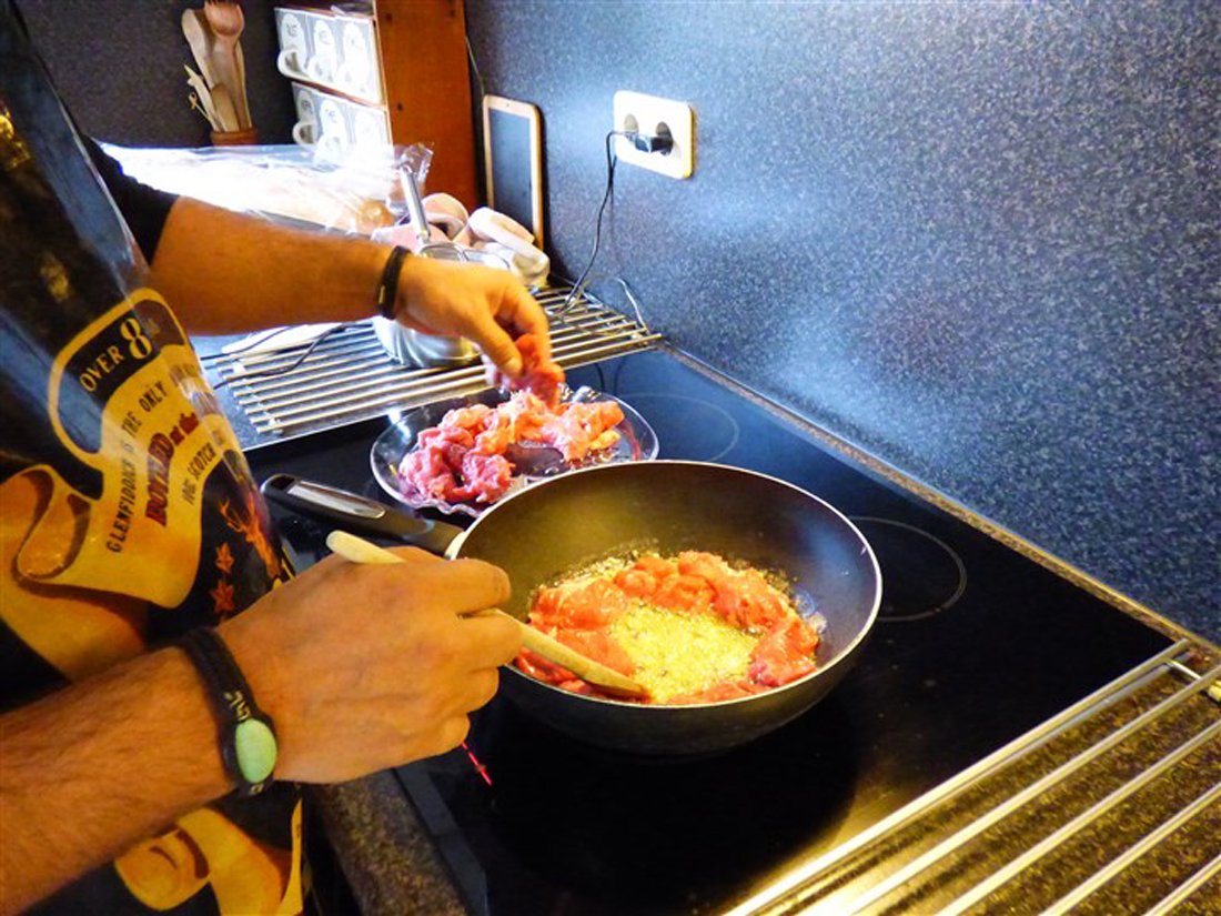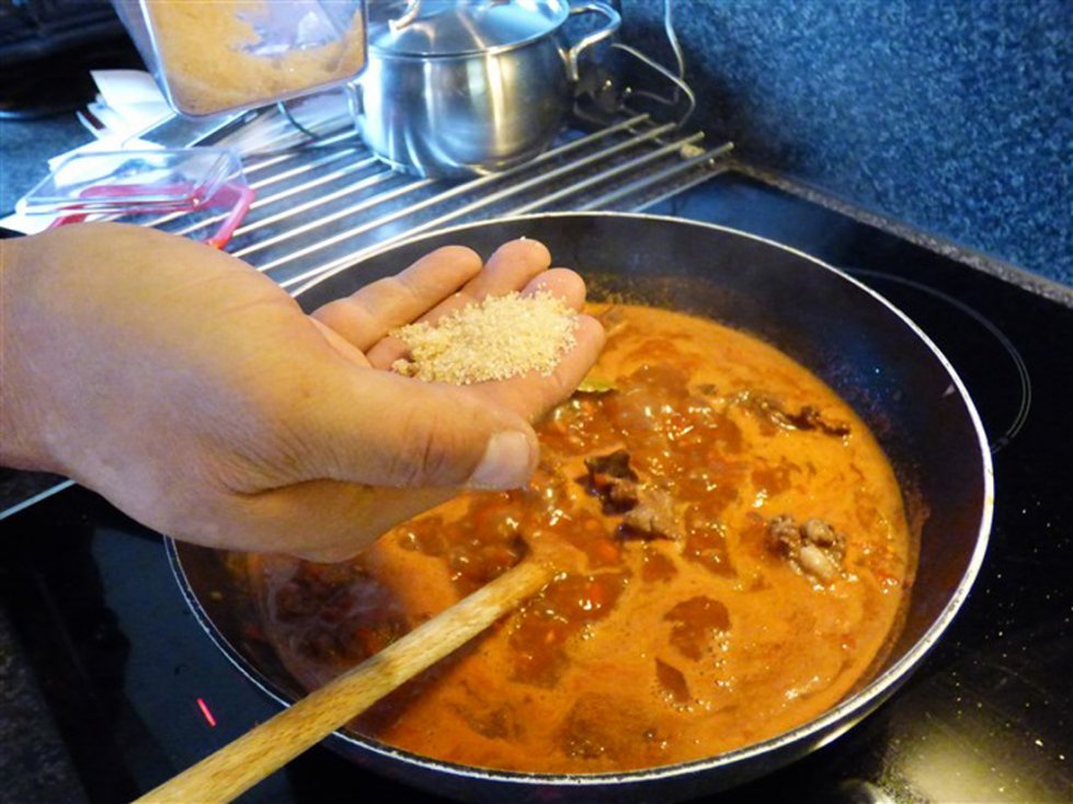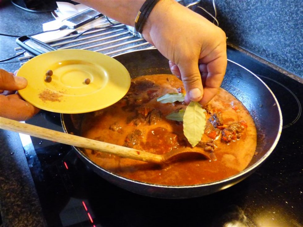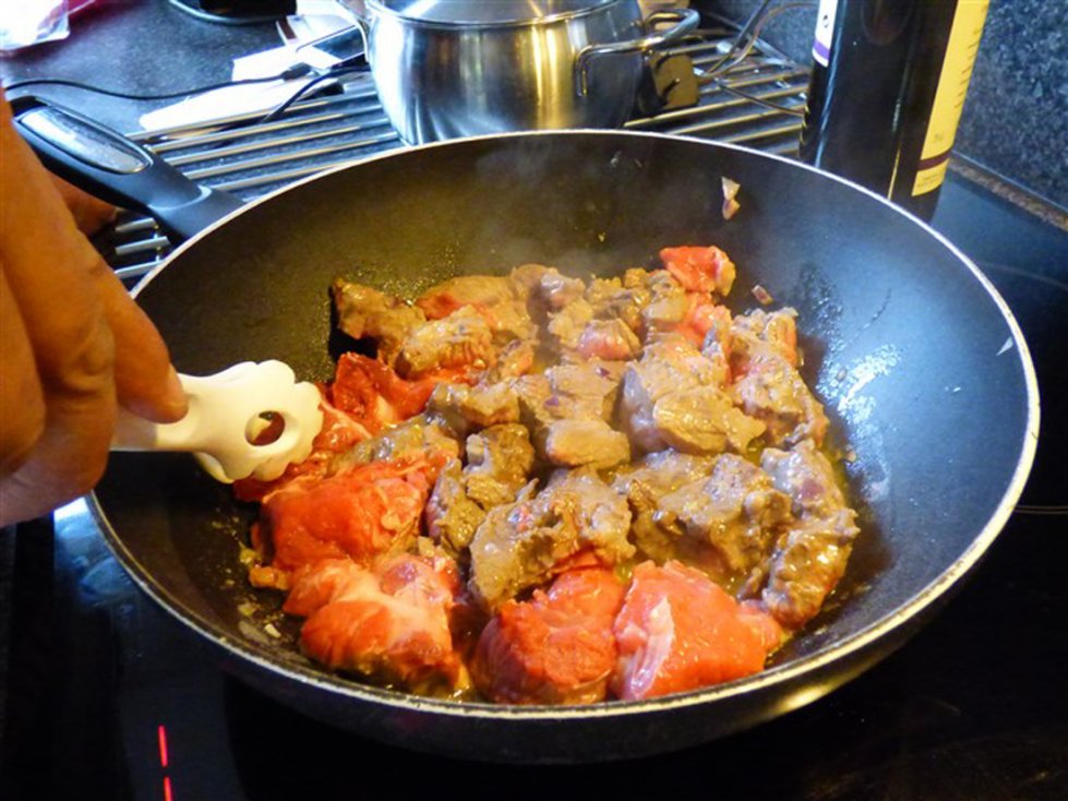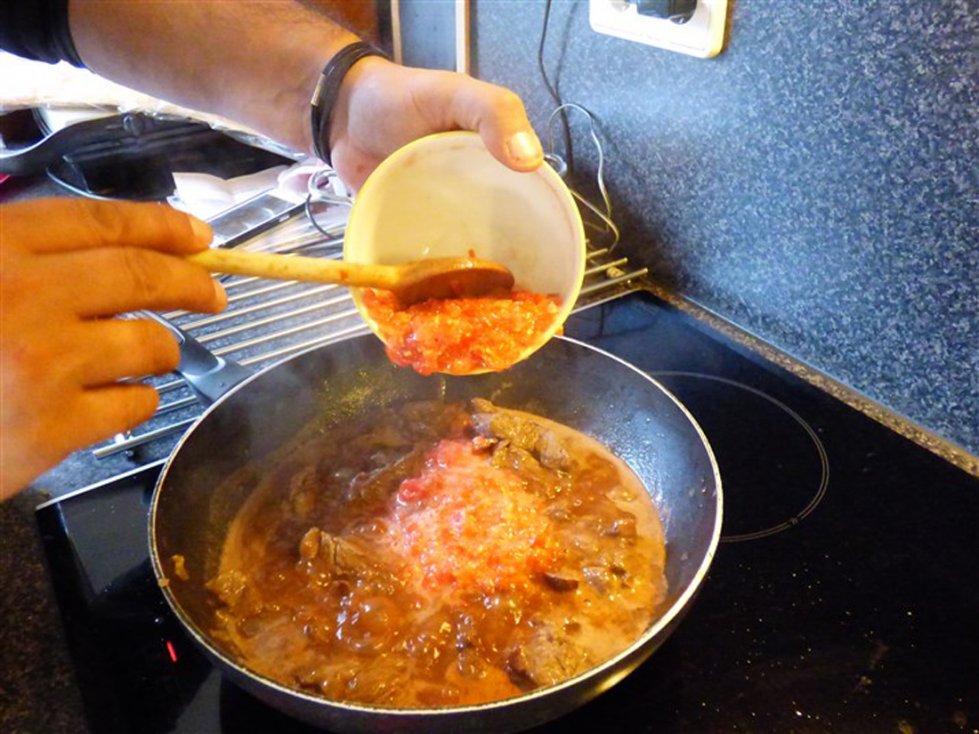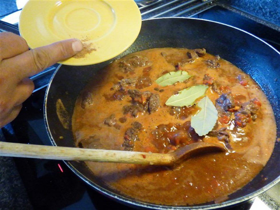 Snijd het vlees in stukken en snipper de ui. Doe de olijfolie in de pan en bak de ui 3 minuten. Voeg daarna het vlees toe en bak dit aan beide kanten bruin. Los de tomatenpuree op in een glas water en giet de helft hiervan in de pan. Voeg nu de blokjes tomaten en vervolgens de laurierblaadjes, de bahári en een snufje nootmuskaat toe. Voeg daarna een beetje suiker toe om de zuurheid van de tomaten wat te verminderen. Doe de deksel op de pan en laat het geheel ongeveer 10 minuten koken, zodat alle smaken goed met elkaar kunnen vermengen.