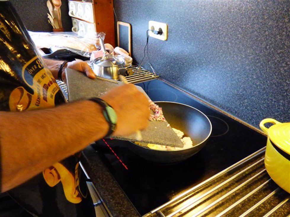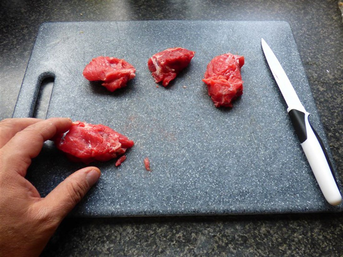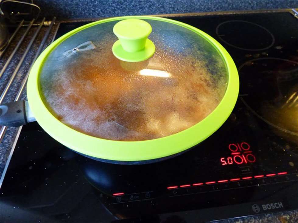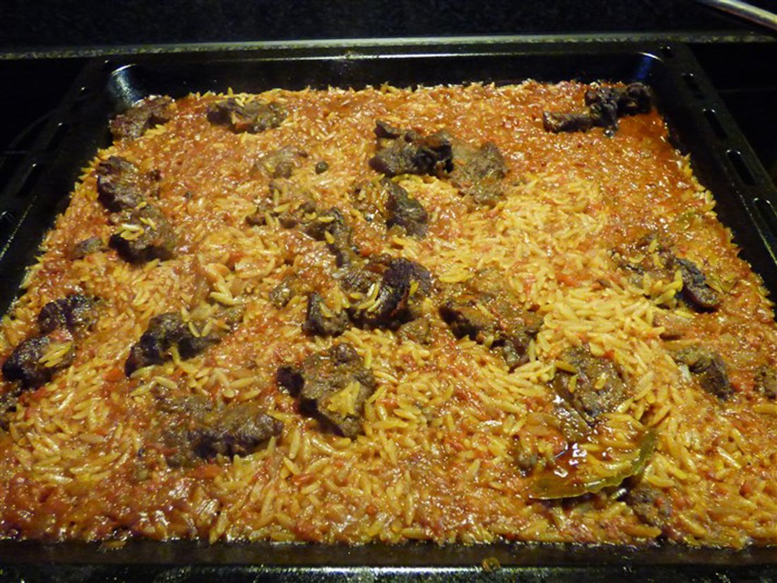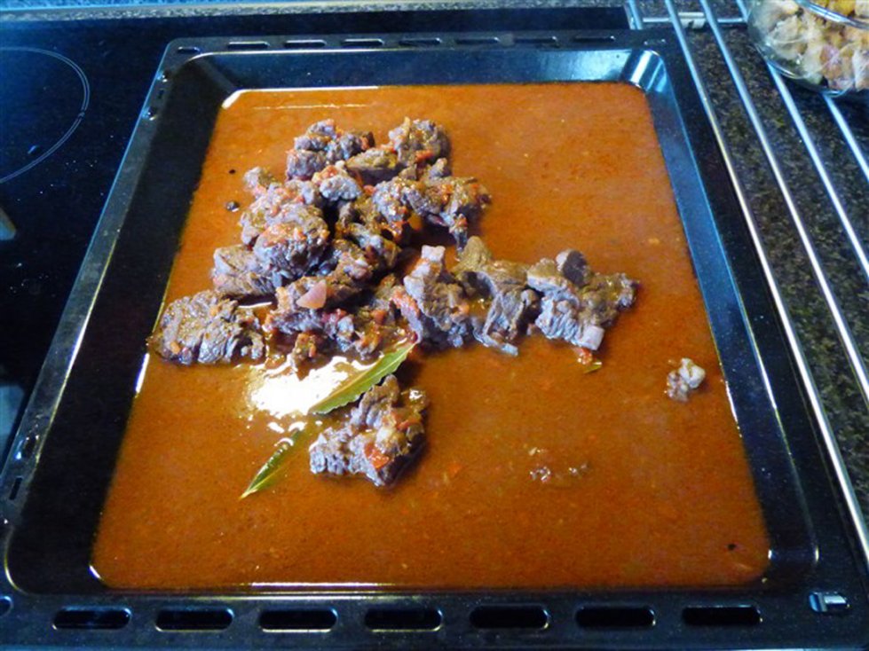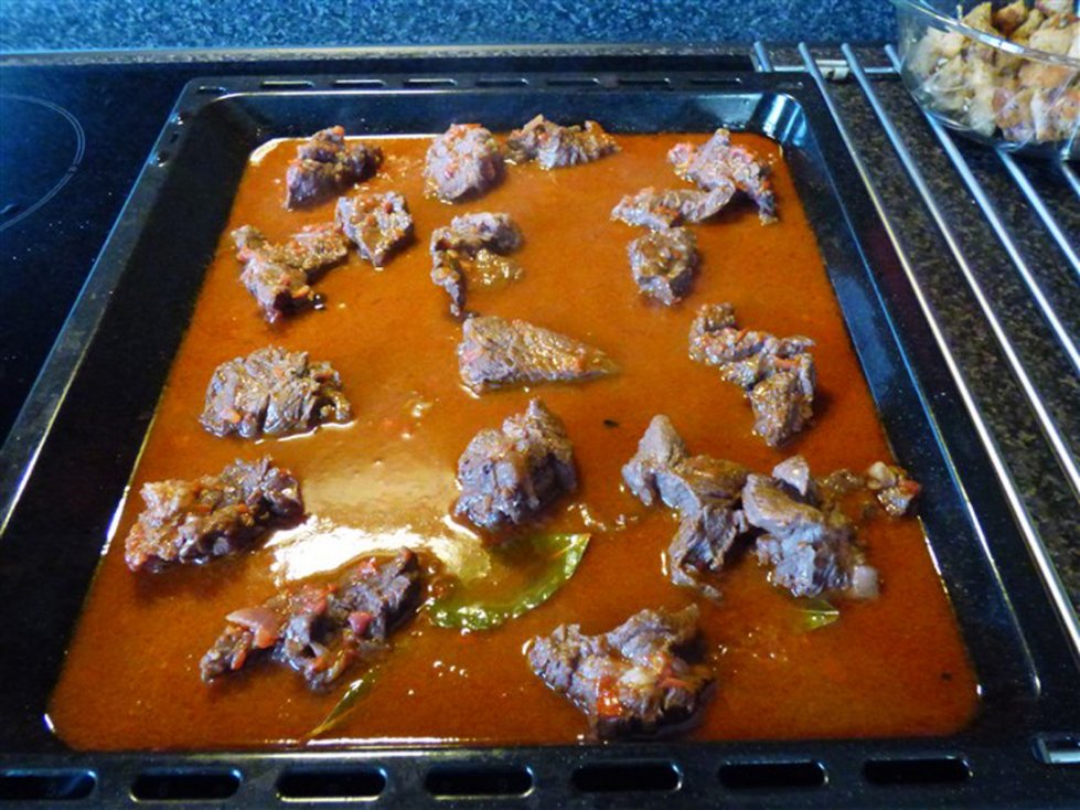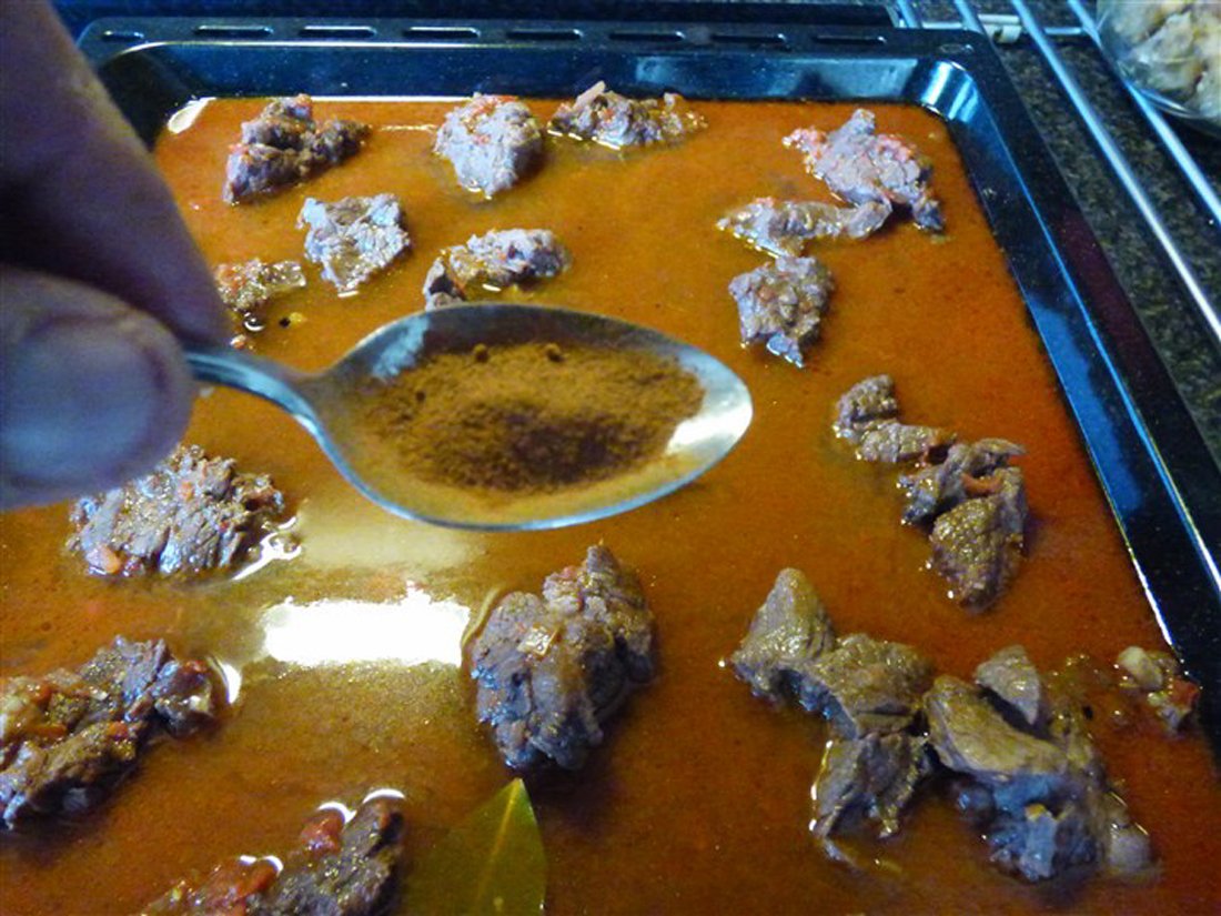 Giet het mengsel vervolgens in een braadslee en verdeel het vlees gelijkmatig. Naar smaak kunt u nu een klein beetje kaneel toevoegen (maximaal een halve theelepel). Zet de braadslee voor 1,5 uur in de oven bij 180 graden.