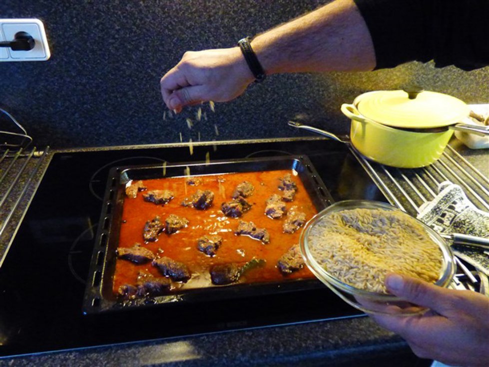 Haal daarna de braadslee uit de oven en voeg de kritharáki toe. Verspreid deze gelijkmatig tussen het vlees. Let op dat u niet te veel toevoegt. De pasta zal namelijk dikker worden. Zorg daarom dat de kritharáki onder een klein laagje vocht staat en niet te veel erbovenuit steekt. Zet de braadslee terug in de oven voor 20 minuten. Voeg tussendoor eventueel nog wat extra in water opgeloste tomatenpuree toe indien de pasta al het vocht opneemt en nog niet zacht genoeg is. De giouvétsi is klaar wanneer de pasta zacht is en er nagenoeg geen vocht meer in de braadslee zit.