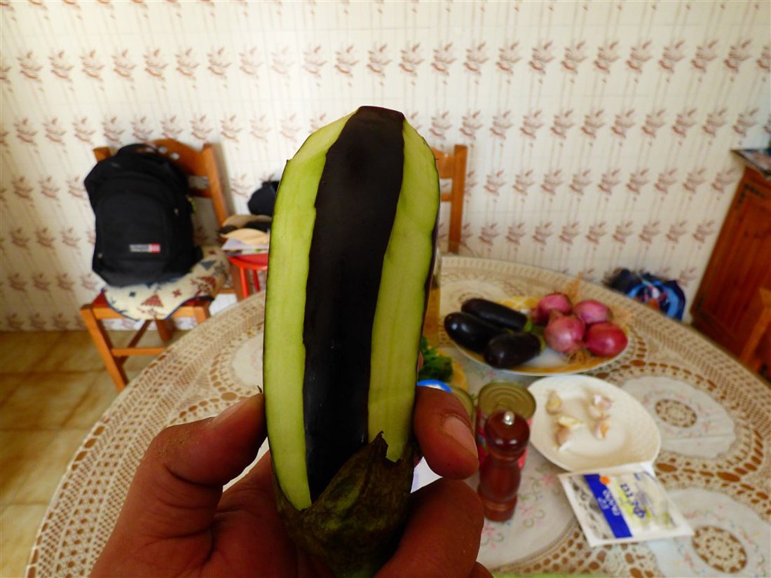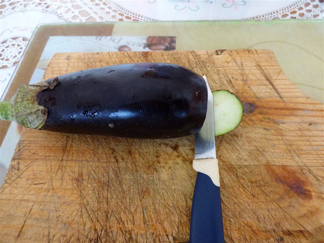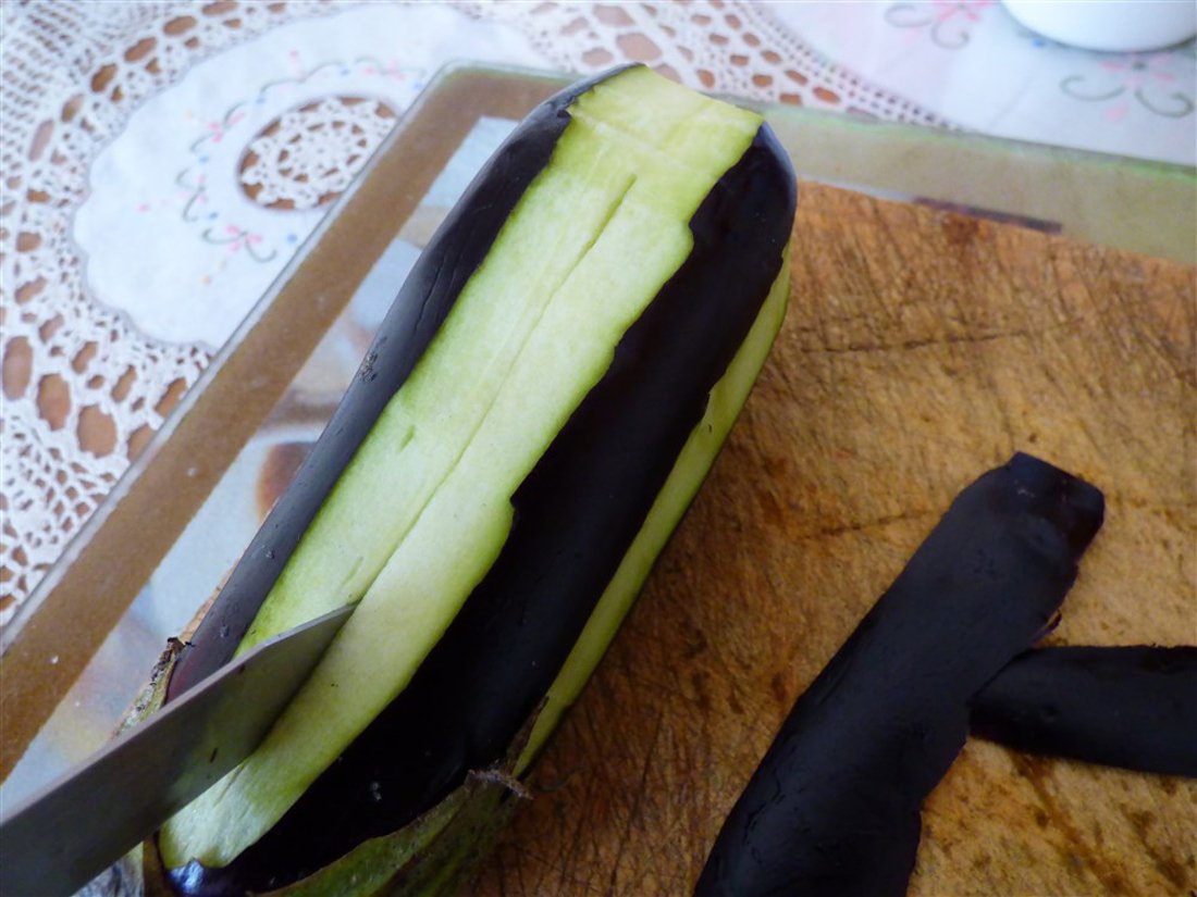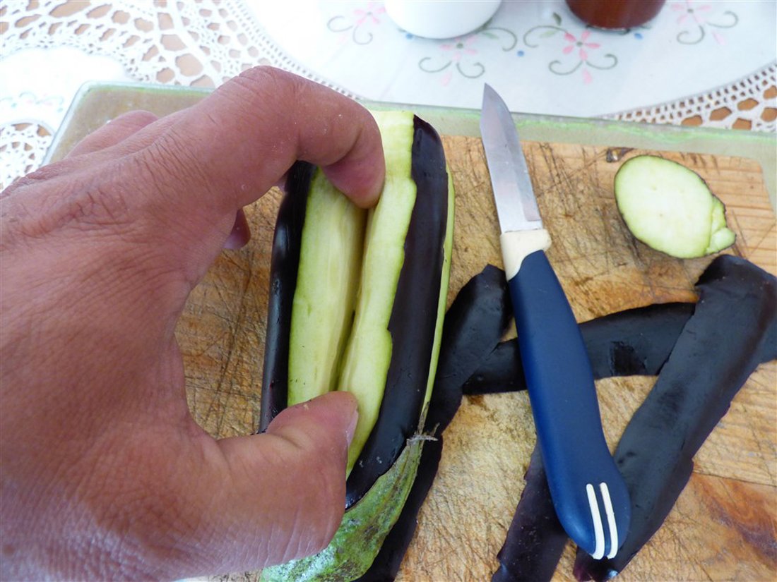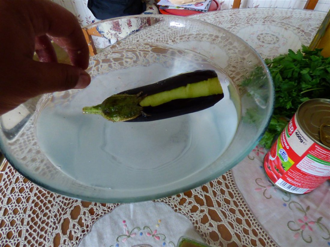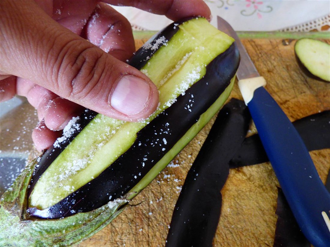 Was de aubergines, snijd de onderkant eraf maar laat de steel zitten. Schil de aubergine in zogenoemde zebrastrepen, door het deels schillen van de aubergine worden de sappen tijdens het koken goed opgenomen. Snijd dan de aubergine over de lengte open en strooi zout in de opening. Vul een schaal met water en strooi ook hier wat zout in. Leg de aubergines in het gezouten water en laat deze 30 minuten hierin weken. Hierdoor verdwijnt de soms wat bittere smaak van de aubergine.