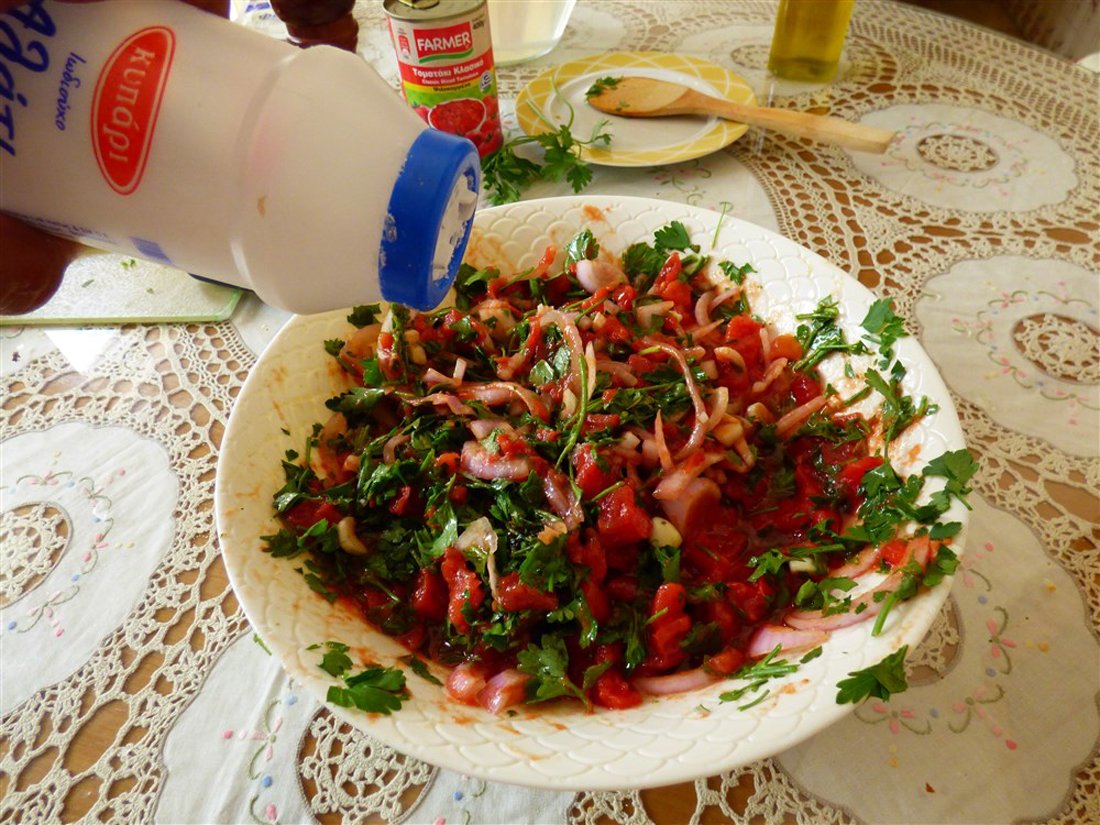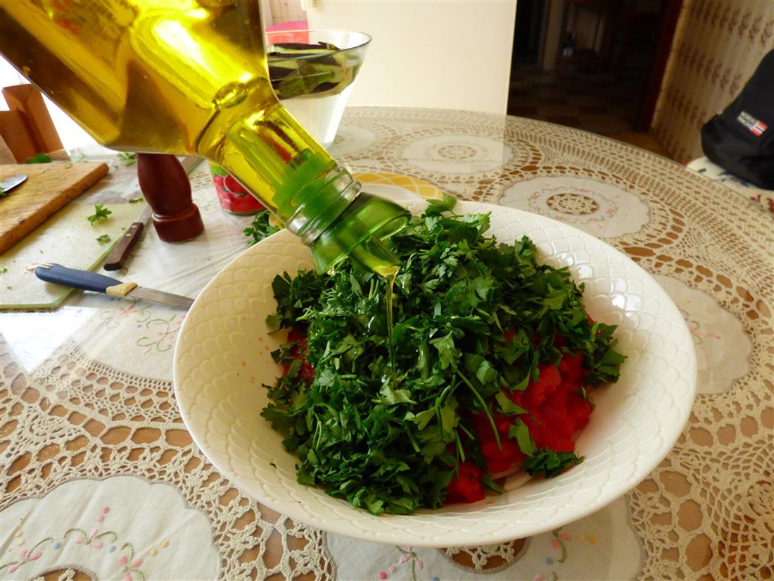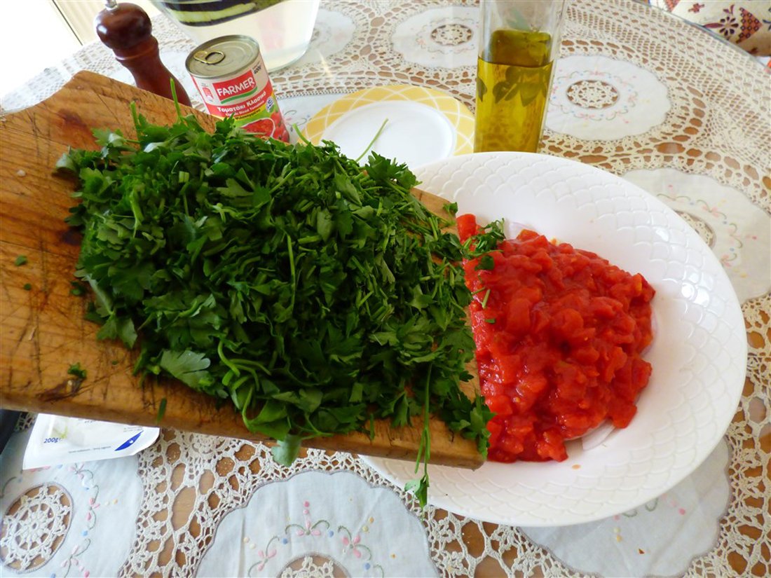 In de tussentijd wordt de vulling van de aubergines voorbereid. Eerst snijden we de uien, knoflook en peterselie. Doe de gesneden uien en knoflook in een kom en voeg hier de tomaat en vervolgens de peterselie aan toe. Giet nu de helft van de olijfolie bij het geheel en strooi er wat zout en peper over. Tot slot wordt de helft van de feta kaas eraan toegevoegd. Mix de ingrediënten goed door elkaar.
