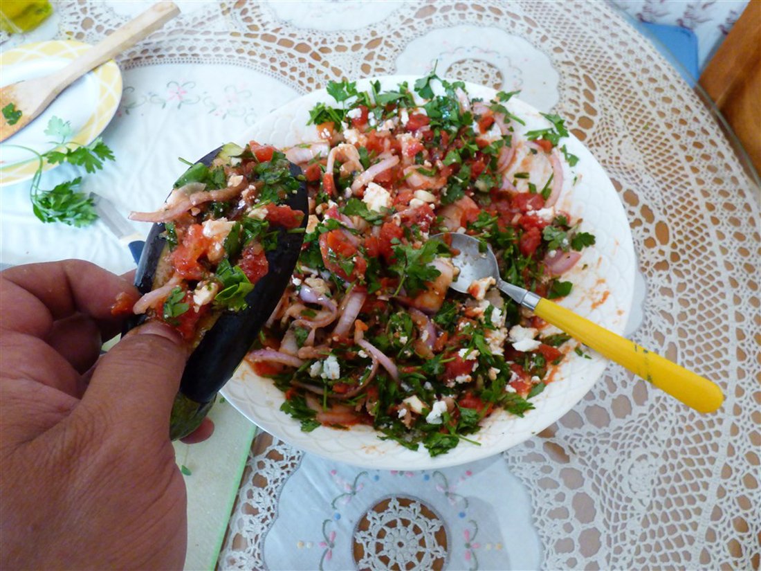 Verwarm de oven voor op 180 graden en haal ondertussen de aubergines uit het water en spoel ze af zodat we kunnen beginnen met het vullen. Vul de aubergine met het mengsel en leg ze in een ovenschaal. De overgebleven vulling gaat bovenop de aubergines in de schaal. Giet nu de rest van de olijfolie over dit geheel. Dek de ovenschaal af met folie en zet de schaal 45 minuten in de oven op 180 graden. Na 35 minuten halen we de folie van de ovenschaal af en wordt de oven ingesteld op 200 graden, hierdoor krijgt het gerecht een mooie kleur.