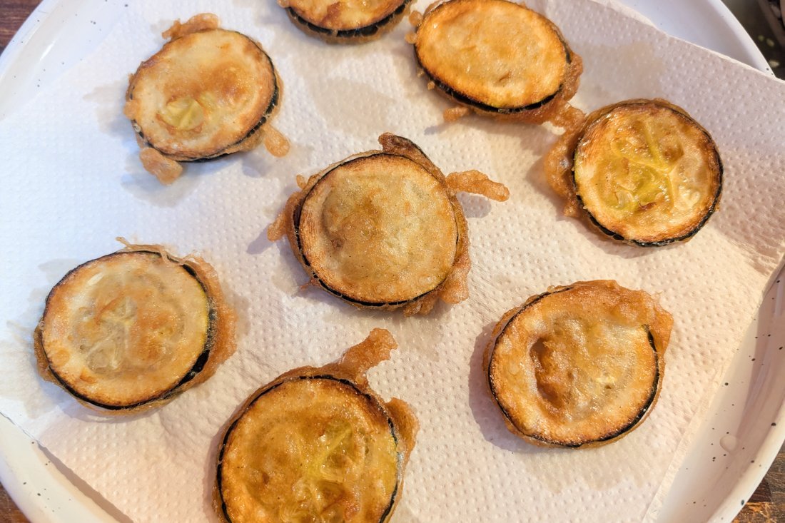 Laat de plakjes uitlekken op keukenpapier en dien ze warm op, eventueel op smaak gebracht met vers gemaalde peper en een beetje geraspte kaas erover.