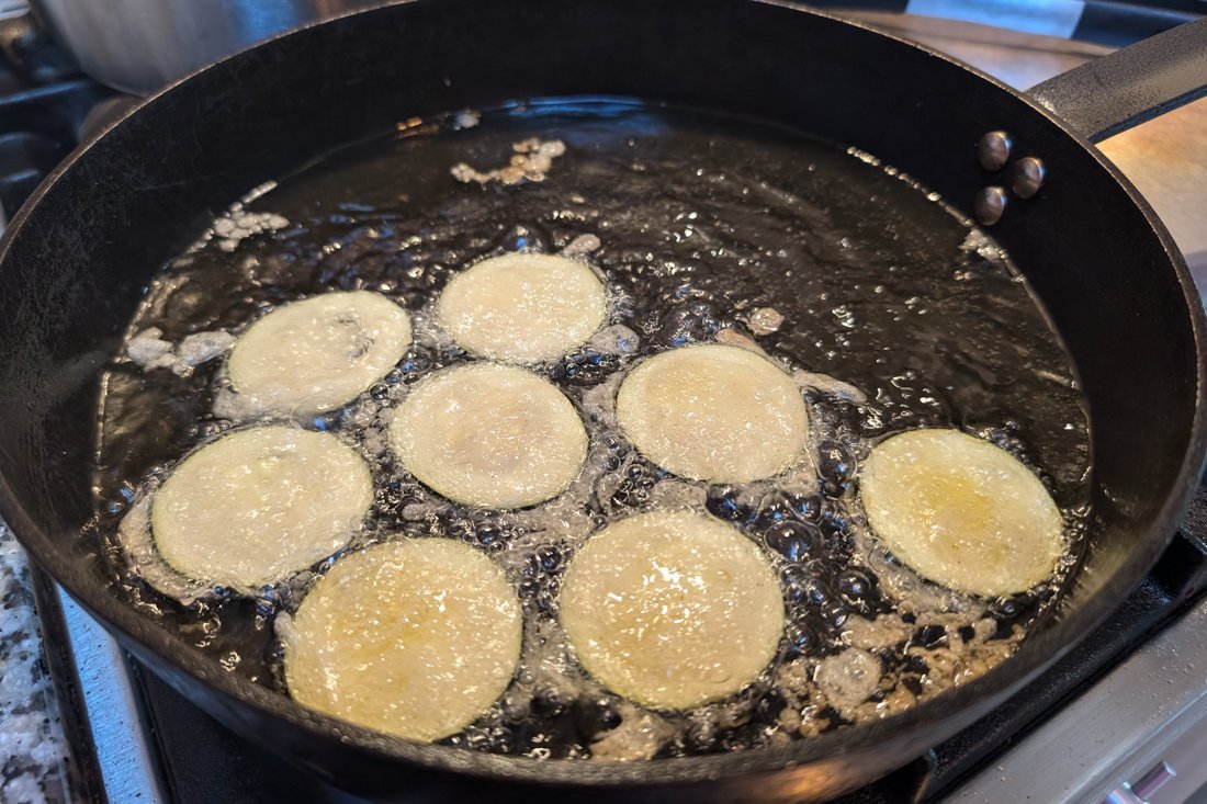 Verhit de olie in een koekenpan, u kunt ook een frituurpan gebruiken, en bak de courgetteplakjes aan beide kanten bruin.