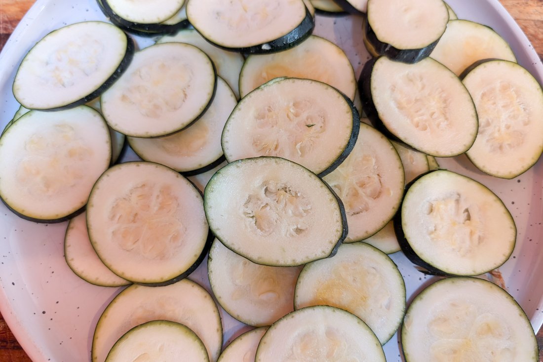 Leg de plakken in een zeef of vergiet, bestrooi ze met een beetje zout en laat ze ongeveer een uur uitlekken.