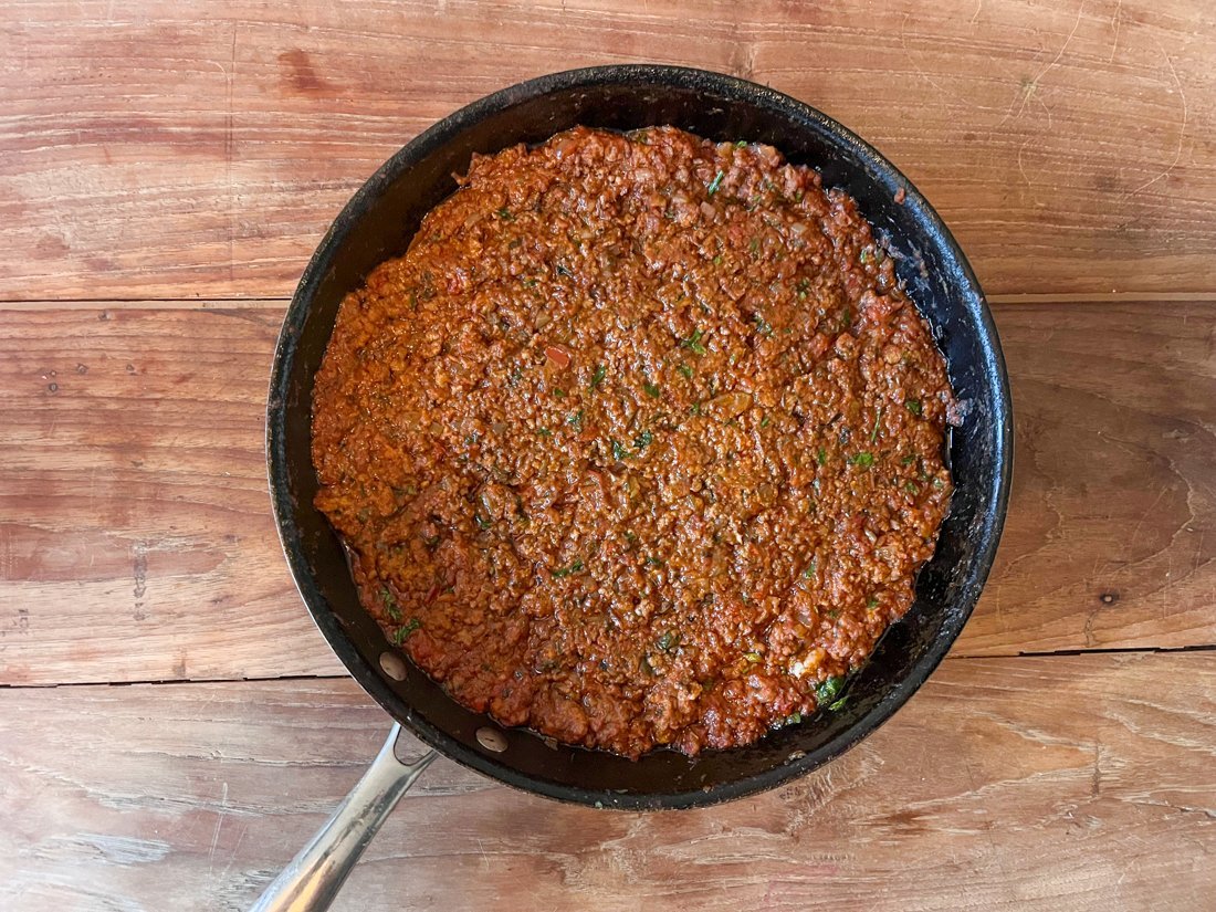 Verhit een pan op hoog vuur met olijfolie. Snipper de ui en voeg deze toe aan de pan. Hak de knoflook fijn en voeg ook dit toe aan de pan, samen met de tijm, kruidnagel, kaneel en suiker. Fruit alles 2-3 minuten tot het mooi gekarameliseerd is. Voeg vervolgens het gehakt toe aan de pan. Wanneer dit rul is geworden, voegt u de tomatenpuree toe en bakt u dit kort mee om de bittere smaak te voorkomen. Hierna mogen de tomatenblokjes toegevoegd worden en bakt u deze 5-10 minuten mee op laag vuur, zodat de saus kan indikken. Haal de pan van het vuur en voeg naar smaak gehakte peterselie, basilicum, zout en peper toe.