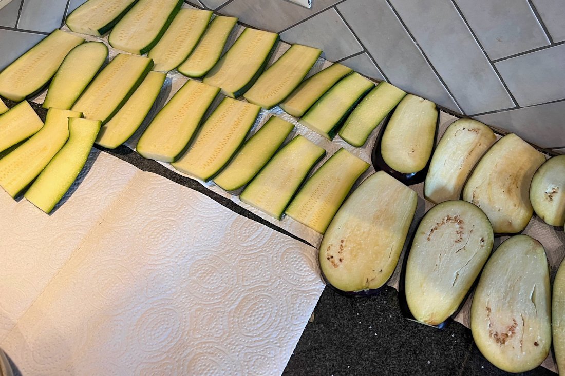 Verwarm de oven voor op 180 graden. Schil de aardappelen en snijd ze in dunne plakjes. Verhit een diepe pan met zonnebloemolie en laat het goed heet worden. Bak de aardappelen goudbruin in de pan. Snijd ook de aubergine en courgette in dunne plakken. Bestrooi de aubergines en courgettes met zout en laat ze uitlekken op keukenpapier. Bak de aubergines en courgettes in 30 minuten goudbruin in de oven. Leg zowel de gebakken aardappelen als de groentes op keukenpapier na het bakken om ze goed uit te laten lekken.