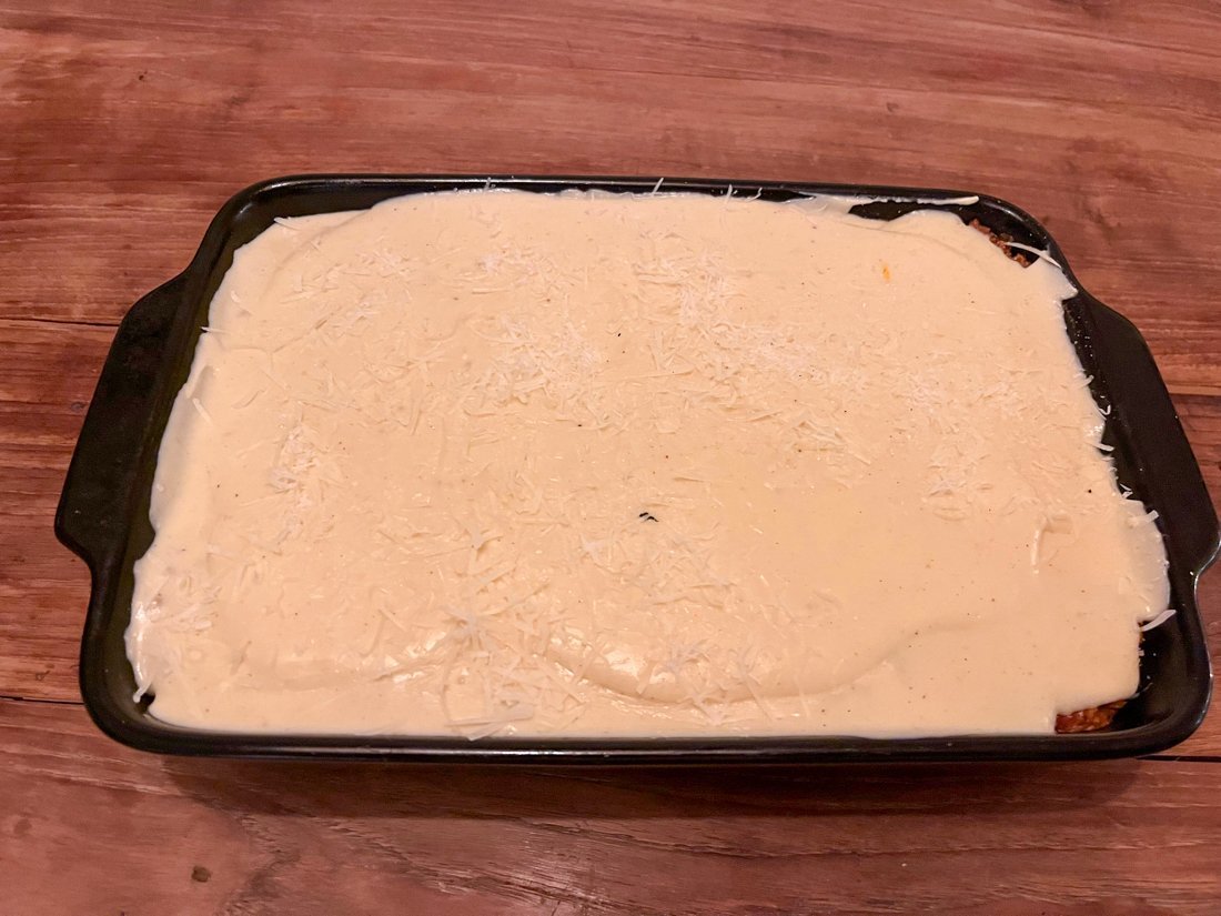 Smelt de boter in een pan op middelhoog vuur. Voeg de bloem toe en klop met een garde tot deze volledig in de boter is opgenomen. Vervolgens voegt u beetje bij beetje de melk toe en blijft u roeren om klontjes te voorkomen. Zodra de saus dik wordt en begint te koken, haalt u de pan van het vuur en roert u de nootmuskaat, zout, peper, 100 gram Parmezaanse kaas en drie eidooiers erdoorheen. Klop de saus goed tot een glad mengsel.