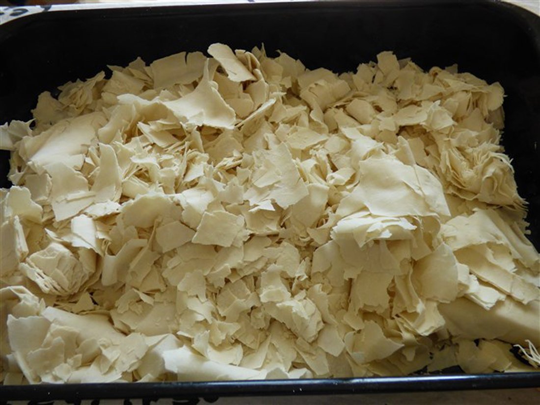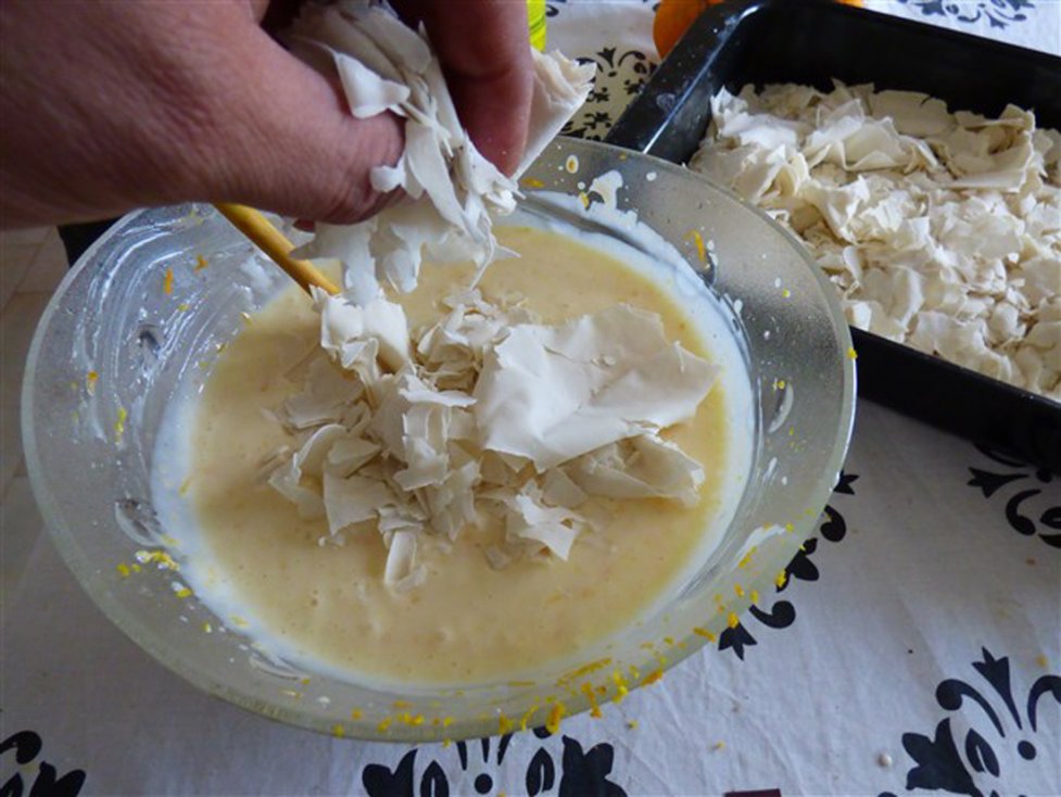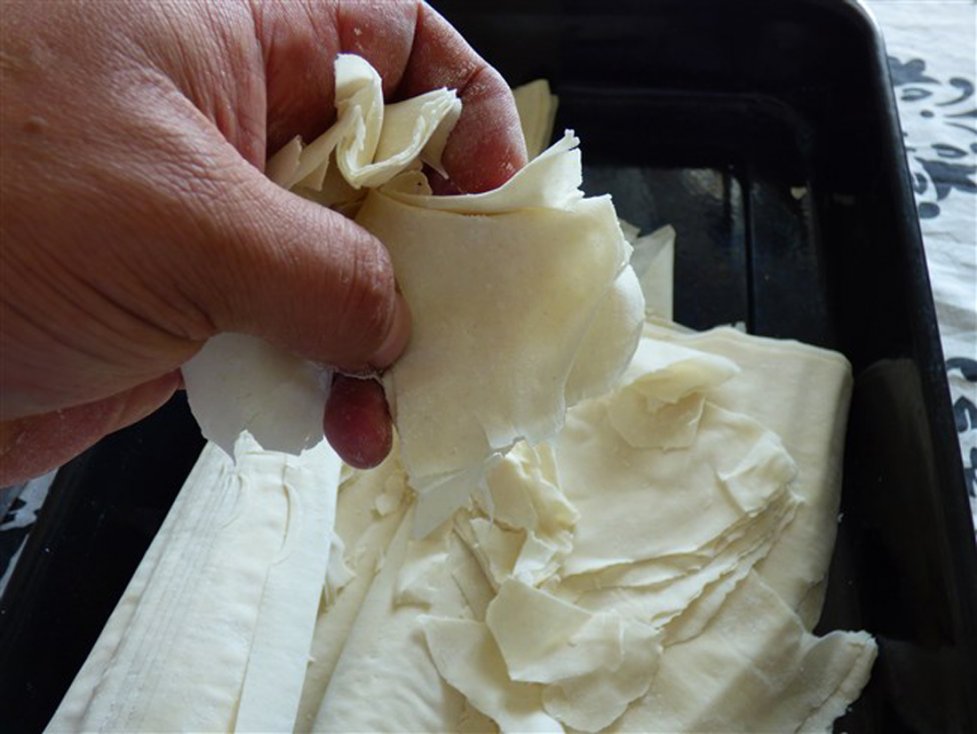 Haal allereerst het filodeeg uit de verpakking, scheur het in stukjes en laat het drogen.