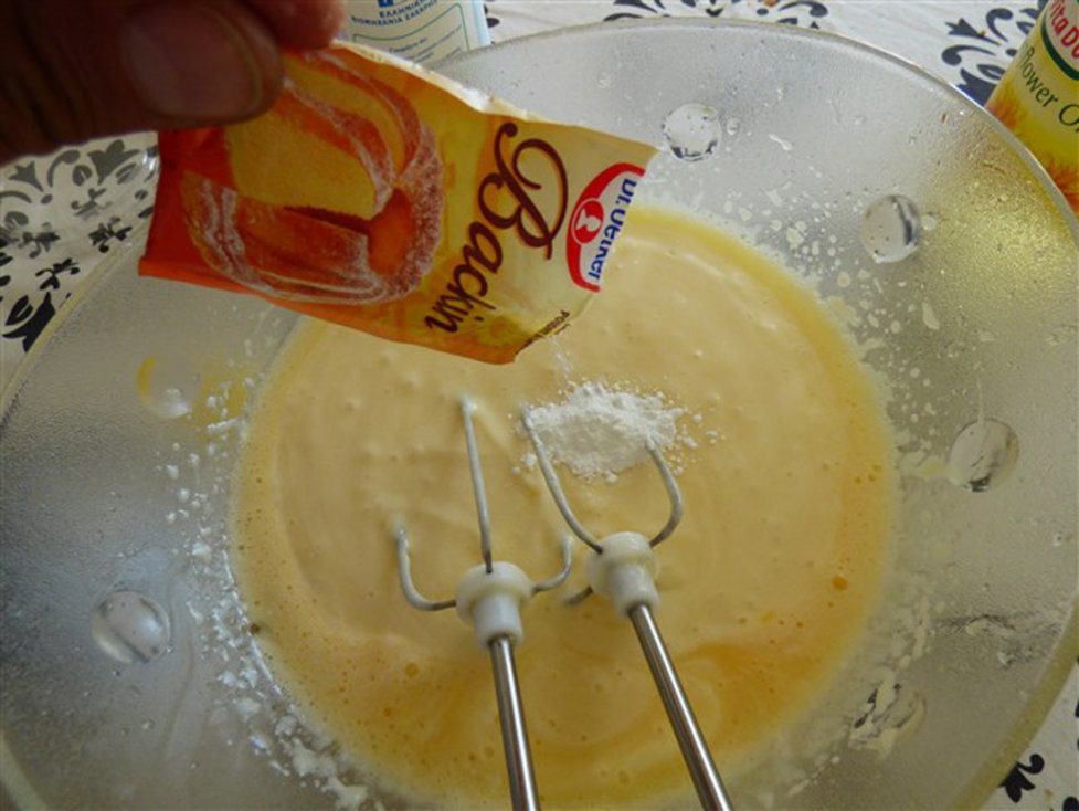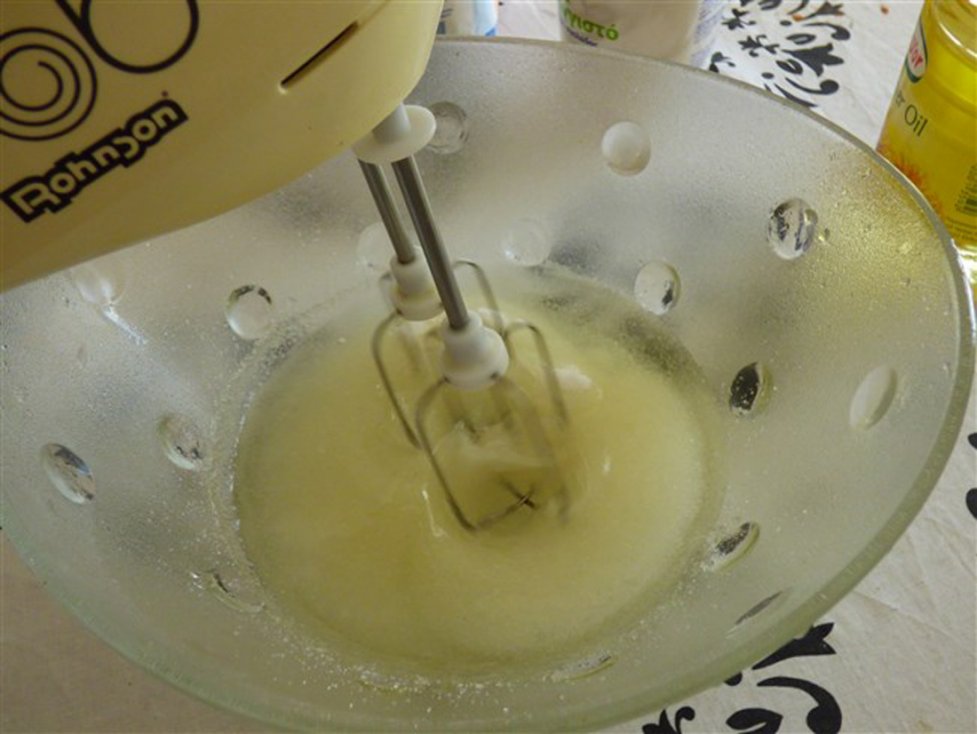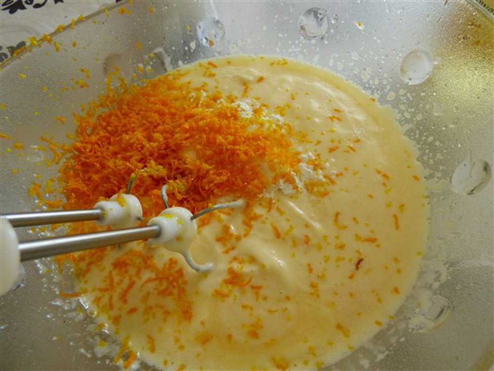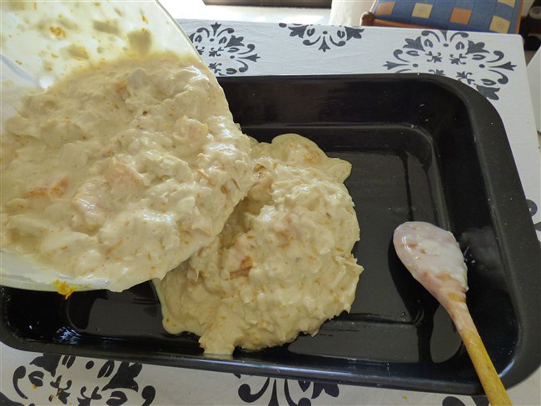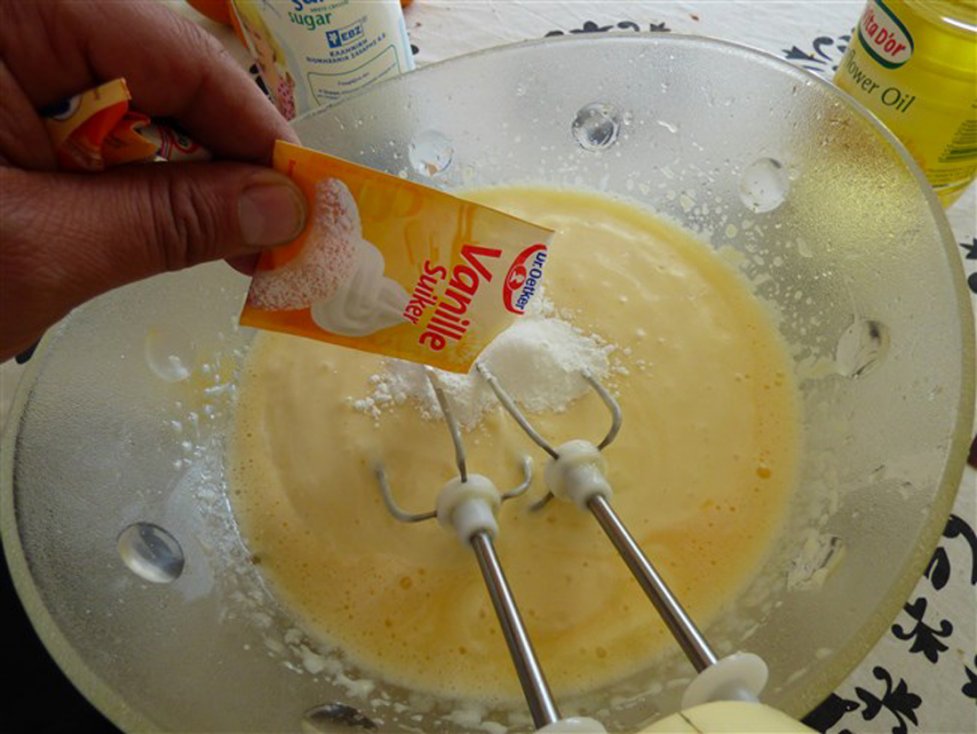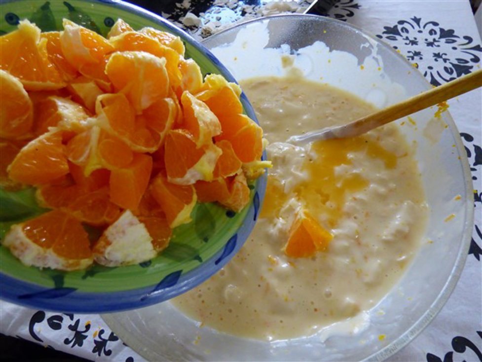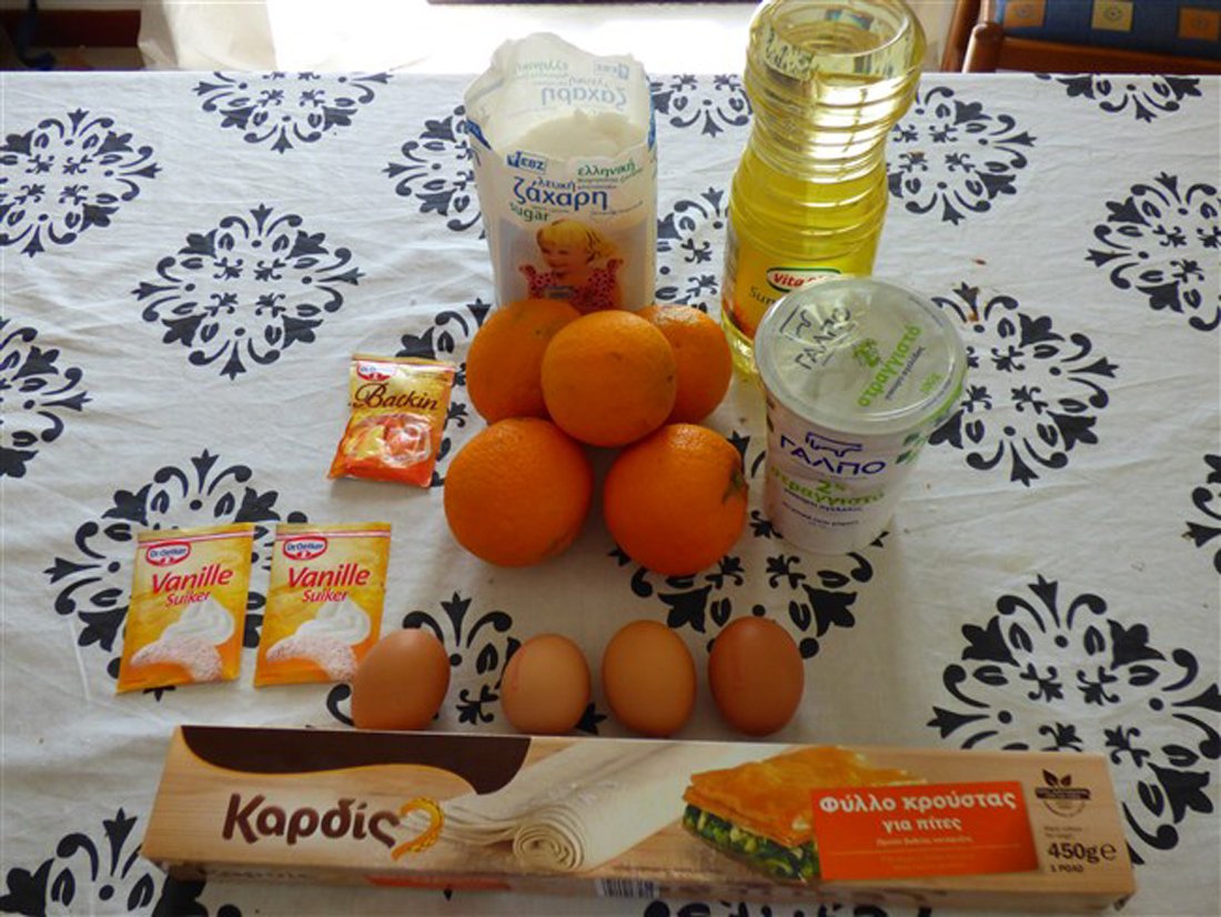 Voor de bereiding van de cake snijdt u eerst twee sinaasappels in partjes. Mix nu de olie en suiker in een kom. Voeg tijdens het mixen de eieren, magere yoghurt, het bakpoeder, de vanillesuiker, sinaasappelrasp en de sinaasappelpartjes toe. Als laatste wordt het filodeeg toegevoegd. Roer dit mengsel goed door tot een soepel beslag ontstaat.