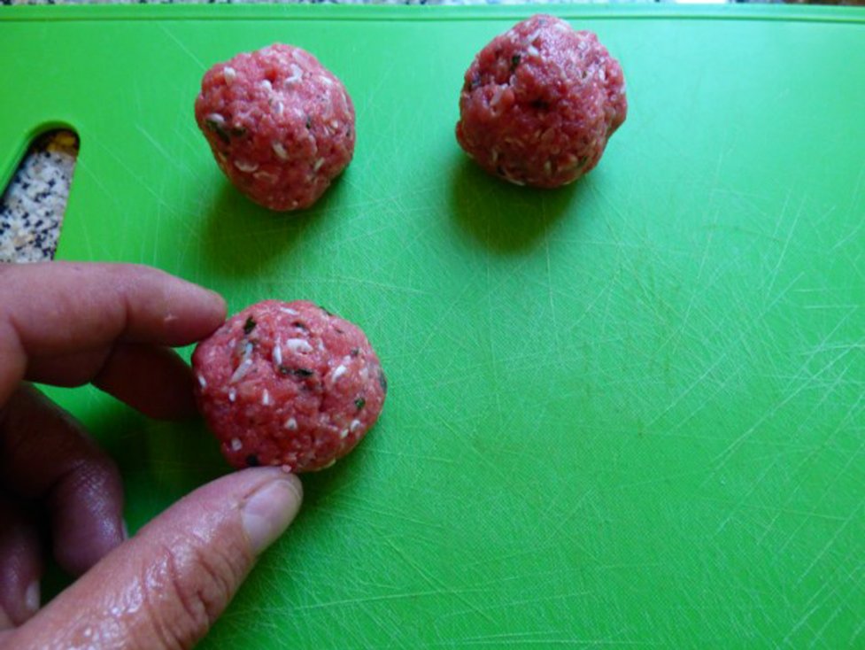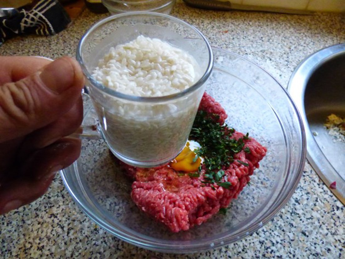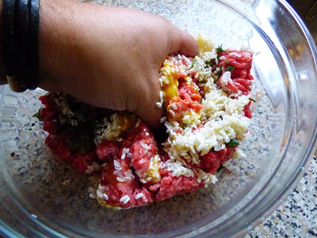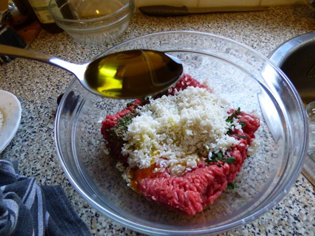 Leg de 100 en 50 gram risotto rijst in afzonderlijke schaaltjes te weken in een laagje water. Snijd de ui, peterselie en mint klein en doe dit samen met het gehakt in een kom. Voeg het ei, de olijfolie, de 100 gram geweekte rijst en de peper en zout toe. Meng het geheel goed door elkaar. Draai hier mooie gehaktballen van, iets groter dan een dobbelsteen.