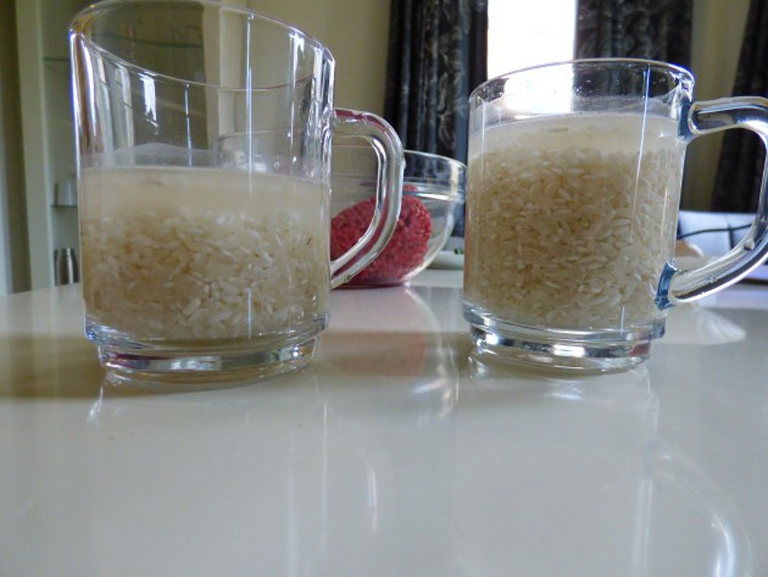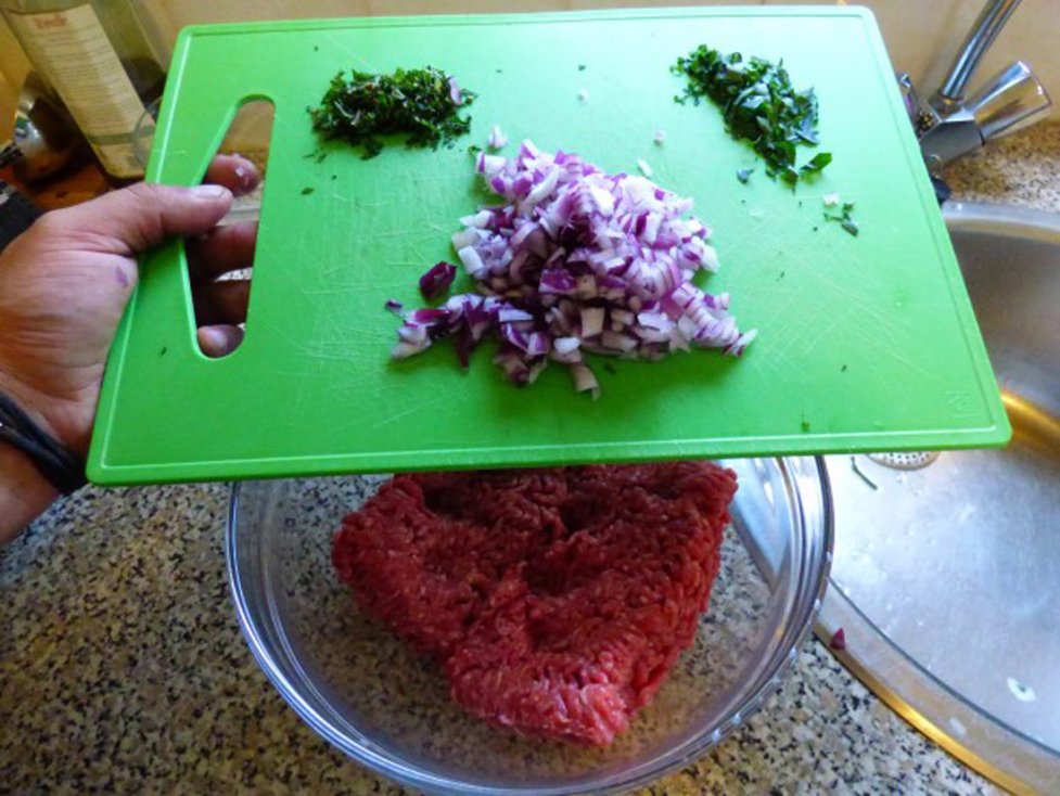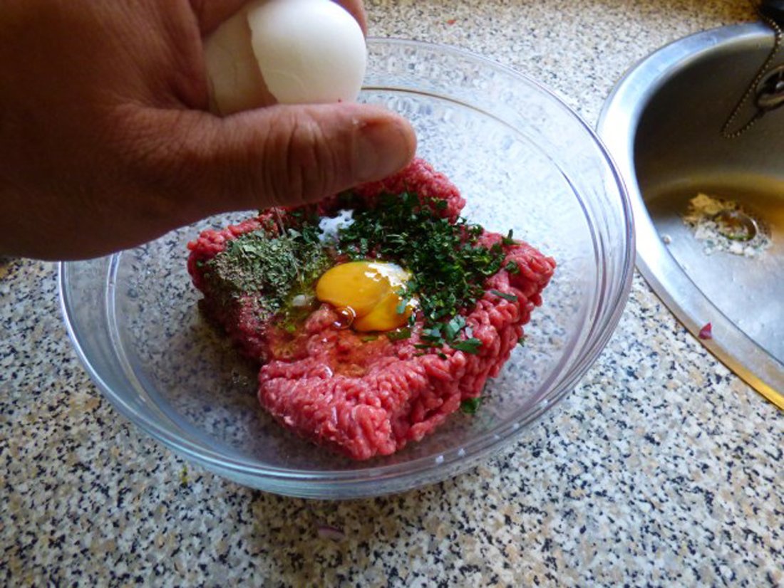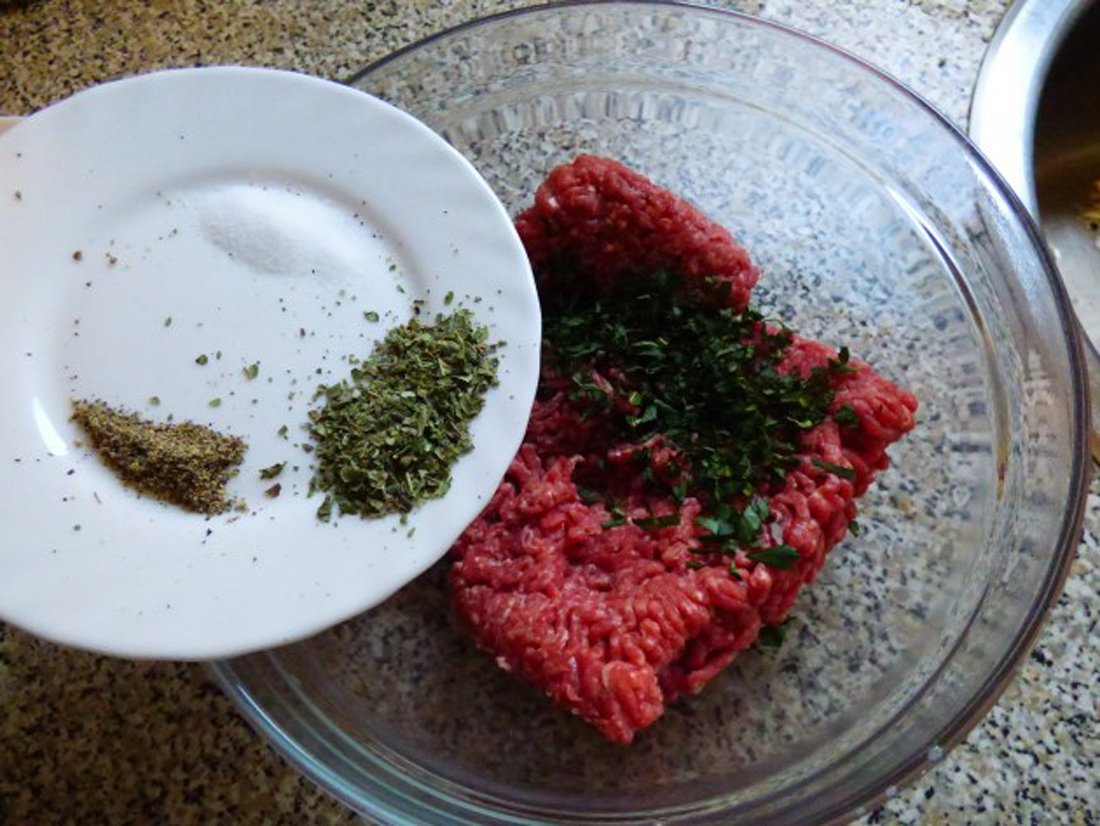 Leg de 100 en 50 gram risotto rijst in afzonderlijke schaaltjes te weken in een laagje water. Snijd de ui, peterselie en mint klein en doe dit samen met het gehakt in een kom. Voeg het ei, de olijfolie, de 100 gram geweekte rijst en de peper en zout toe. Meng het geheel goed door elkaar. Draai hier mooie gehaktballen van, iets groter dan een dobbelsteen.