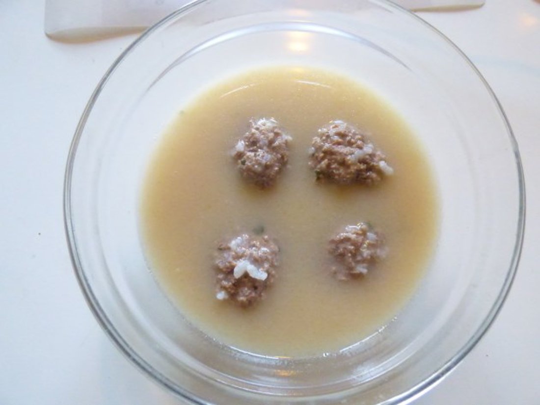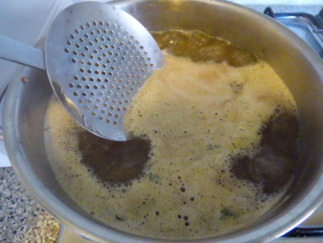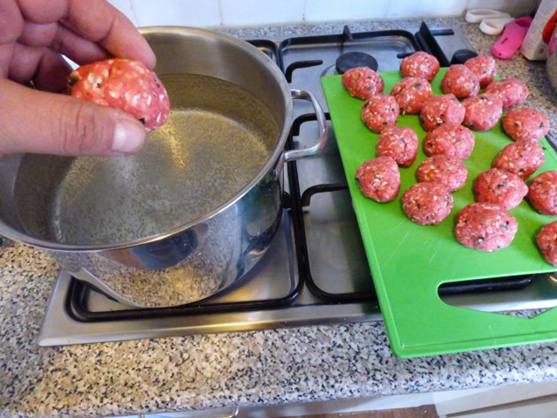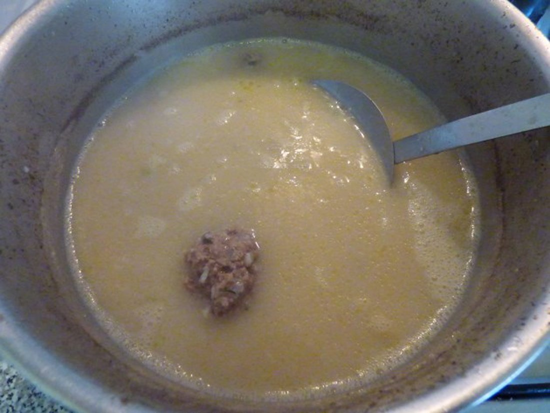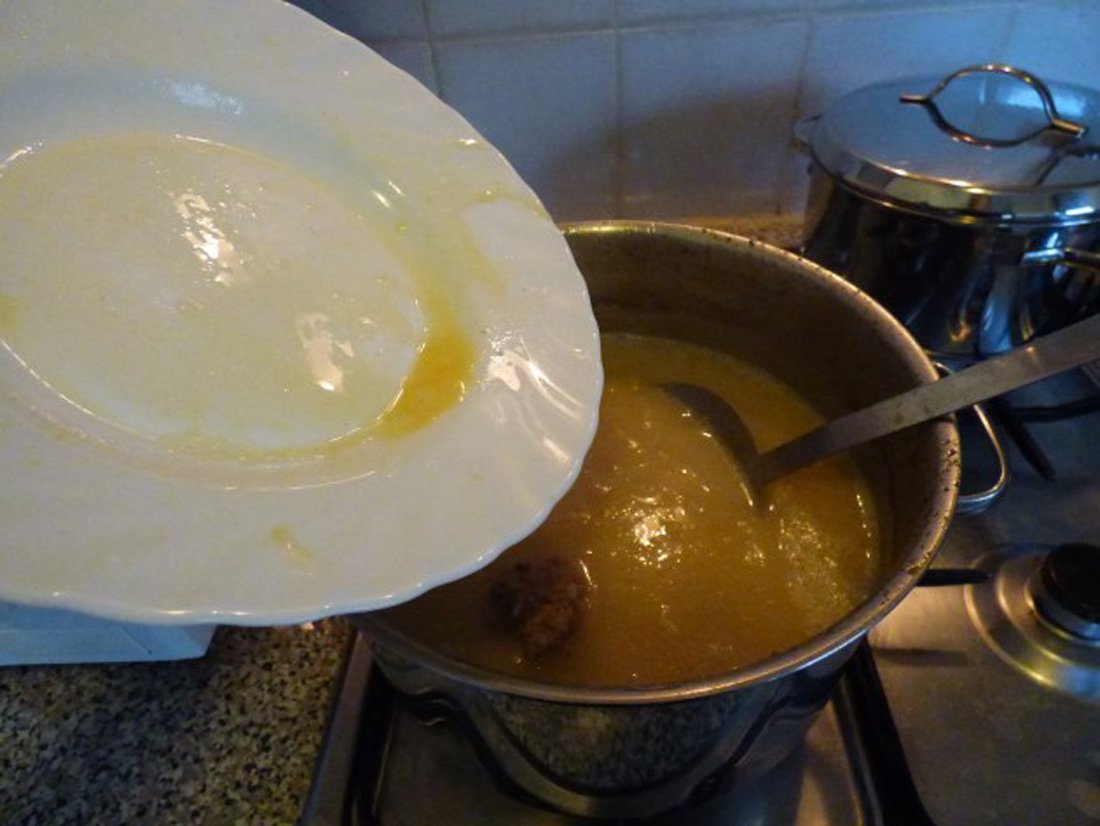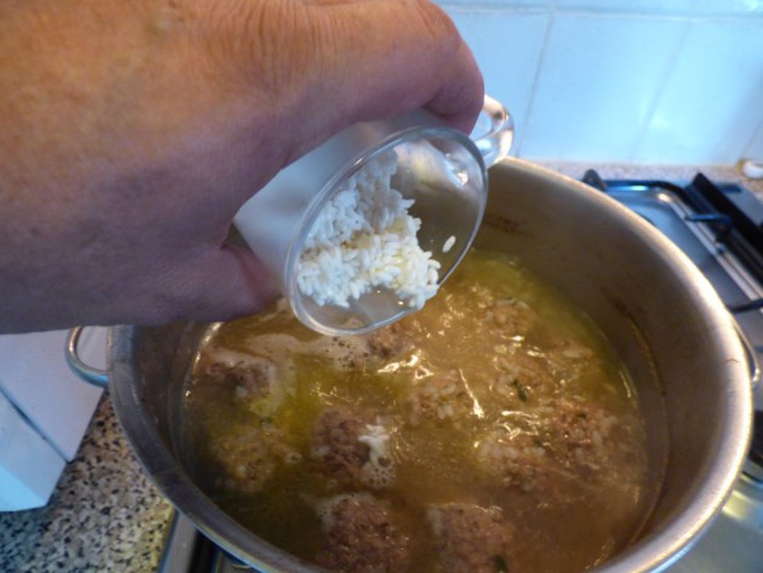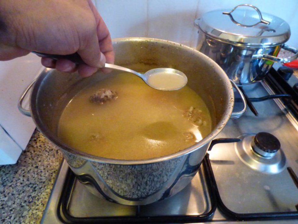 De ballen laten we even rusten en we gaan aan de gang met de soep. Breng 3 liter water aan de kook en leg de gehaktballen in het kokende water, samen met 1 theelepel zout en 1 theelepel peper. Door het koken van het vlees ontstaat er een schuimlaag; met een schuimspaan deze verwijderen. Na 20 minuten koken, voegt u 50 gram geweekte risotto rijst toe en kookt u het nogmaals 20 minuten. Na deze 20 minuten haalt u de pan van het vuur. Nu is het tijd voor de de bereiding van de ei-citroen saus.