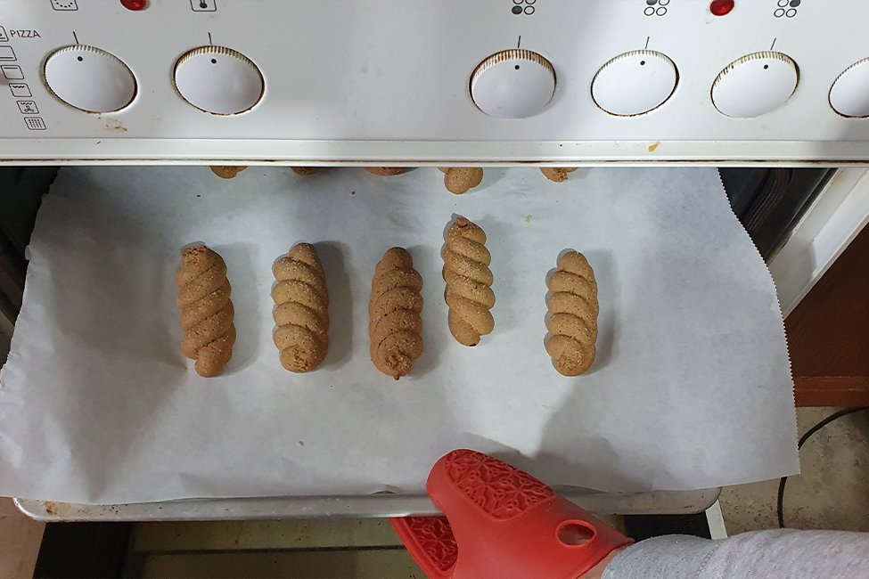 Klop de boter in een kom op tot hij luchtig is, voeg hierna de suiker toe en meng dit door de boter. Tip: “doe de suiker eerst in een blender en maak het erg fijn zodat het makkelijker opgenomen wordt in de boter”. Voeg vervolgens de vanille, het zout en de sinaasappelschil toe en klop het geheel op met de medium- tot hogesnelheidsfunctie van de mixer. Mix in een andere kom de bloem met het bakpoeder en zet dit even aan de kant. Hierna mogen de eieren toegevoegd worden aan de boter, doe dit één voor één en klop de eieren door de boter. Als het geheel is opgeklopt voegt u de sinaasappelsap en de baking soda toe, dit zal ervoor zorgen dat het sinaasappelsap gaat schuimen. Klop het geheel wederom op zodat het één geheel vormt. Vervolgens mag de bloem met het bakpoeder toegevoegd worden aan de boter, doe dit in 2 à 3 keer en meng de boter iedere keer ongeveer 4 minuten met de bloem en het bakpoeder. Maak kleine bolletjes van het deeg en leg deze op en plaat met bakpapier, verwarm de oven voor op 160 graden Celsius en klop een ei op met een lepel suiker en wat water en veeg dit met een kwastje over de koekjes heen voor de finishing touch. Bak de koekjes af in 25 minuten. Kalo pascha!