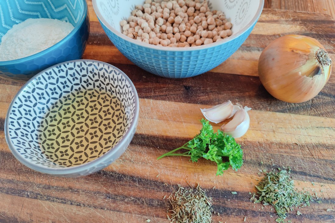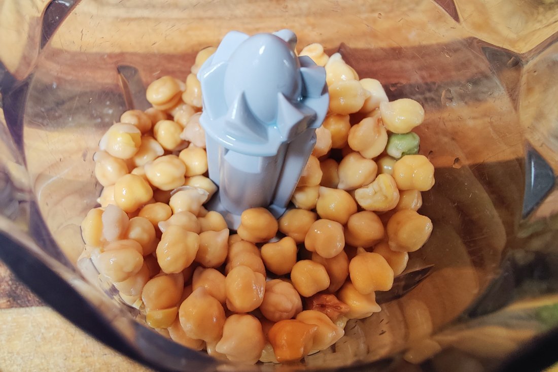 Giet de kikkererwten af en dep ze heel goed droog. Wrijf de kikkererwten in een keukendoek zodat er zoveel mogelijk vliesjes loslaten. Doe de kikkererwten in een keukenmachine en maal deze zodat er een grove pasta ontstaat. Er moeten nog kleine korreltjes zichtbaar zijn.