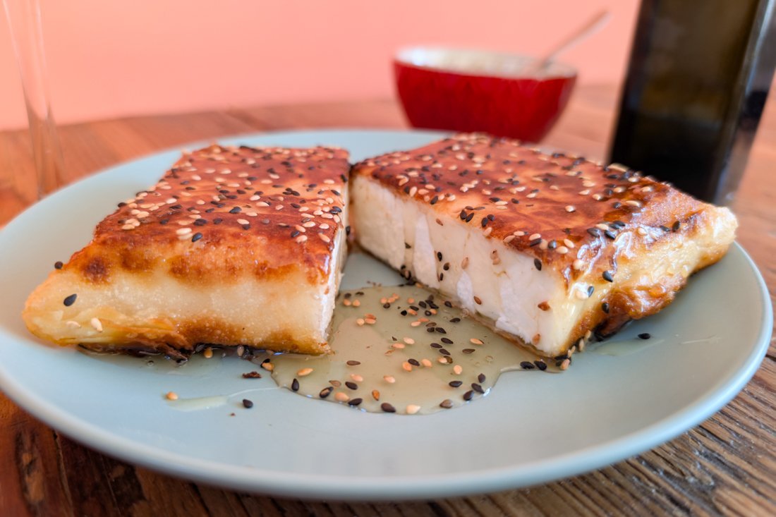 Giet naar smaak honing over de pakketjes, de Grieken doen dit royaal, en bestrooi ze met de witte en zwarte sesamzaadjes. Kali oreksi!