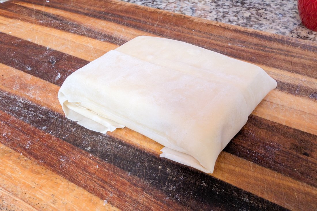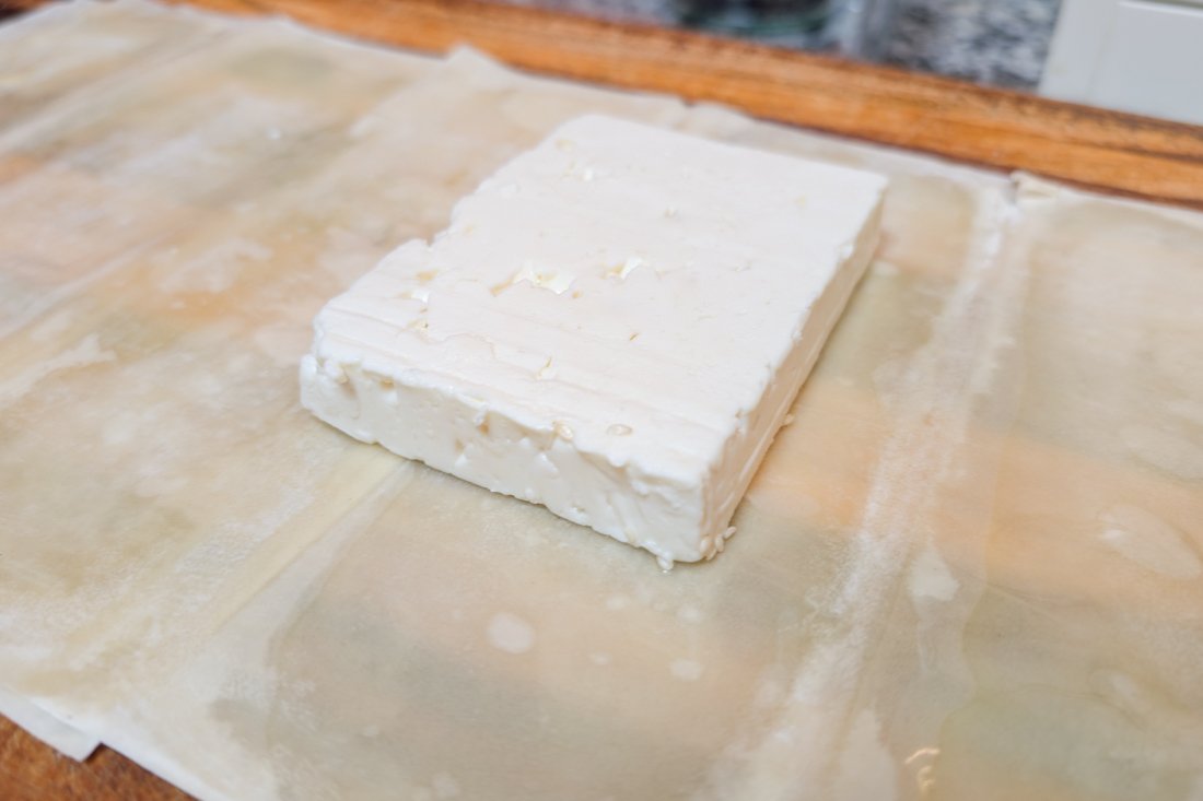 Leg de feta op het filodeeg en maak hier pakketjes van door het deeg 2x om de stukken feta te wikkelen. ‘Lijm’ de oppervlakten en de randen aan elkaar door het deeg met het eiwit te bestrijken. Het handigst doet u dit met een kwastje. Het deeg wat na het 2x omwikkelen nog over is, snijdt u gewoon af.