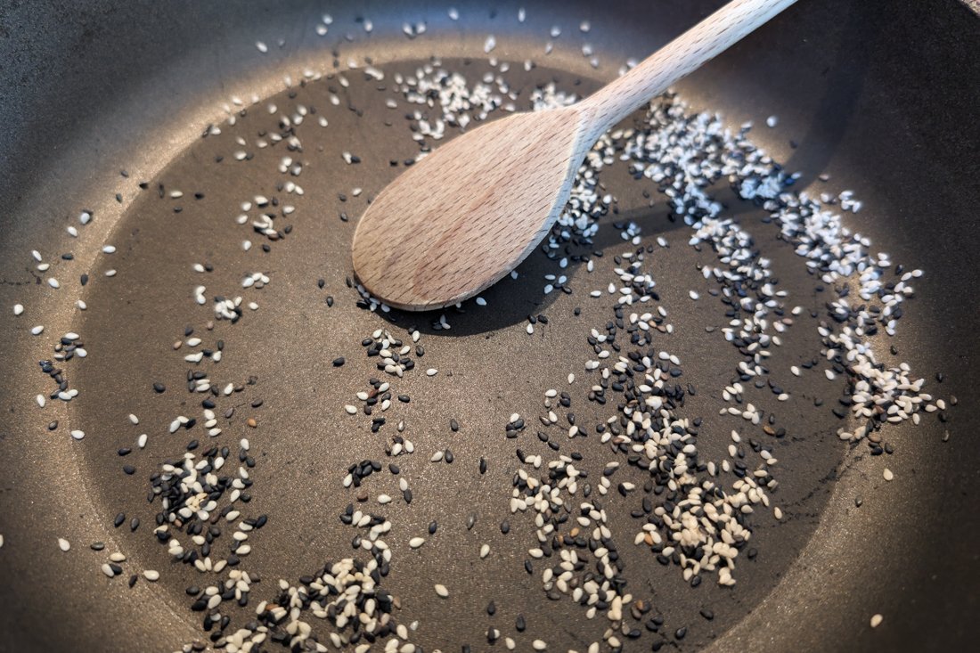 Vlak voordat u aan tafel gaat, bakt u in een kleine koekenpan zonder olie heel eventjes de witte sesamzaadjes tot ze heel lichtbruin worden. Blijf de sesamzaadje met een houten lepel door elkaar roeren. Na ongeveer een minuut beginnen de zaadjes uit de pan te springen, dan zijn ze klaar.