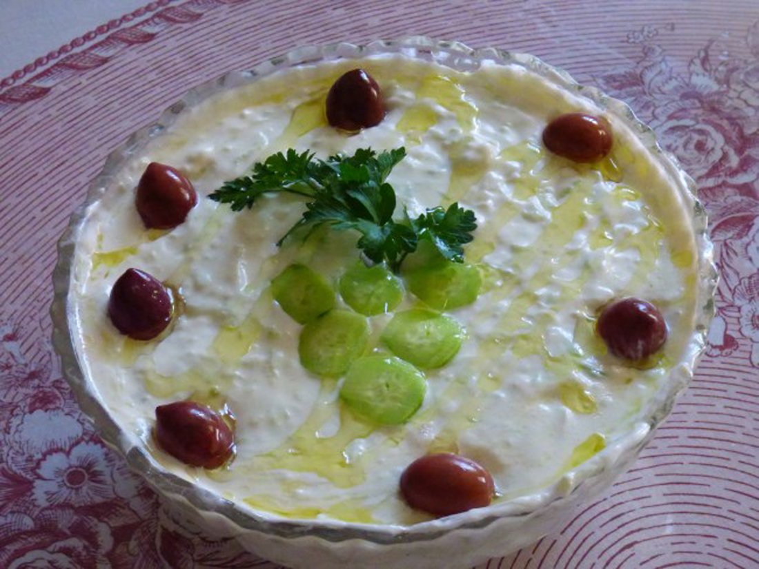 U kunt de tzatziki presenteren met wat olijfjes, komkommers en olie. Heerlijk als dip bij brood vooraf of bij vleesgerechten zoals een pita gyros.