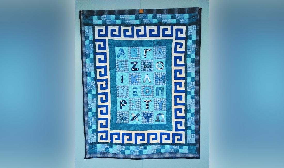 Mevr. Termeer | Deze quilt heeft mevrouw Termeer gemaakt naar aanleiding van haar reis naar Skyros in 2006, De inspiratie kwam door het badkamermatje dat dit patroon had. Mevrouw Termeer zegt dan ook: “Ik haal hem regelmatig tevoorschijn, zeker nu, en probeer hiermee de gedachten vast te houden aan de vele Rossreizen die ik al sinds 2003 gemaakt heb.” ![]()