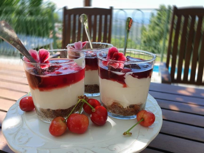 Onze collega Sander ging samen met Savvas naar Villa Kerasia om de kersen van deze kersenboom te plukken. Savvas had het idee om er een heerlijke compote van te maken en dat af te werken als toetje. Zo hebben ze zich beloond op een heerlijke cheese cake met verse kersen, geplukt van de kersenboom.