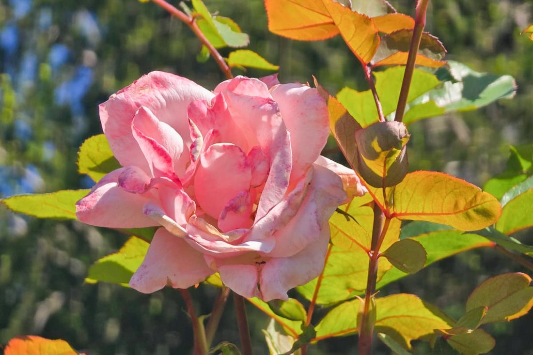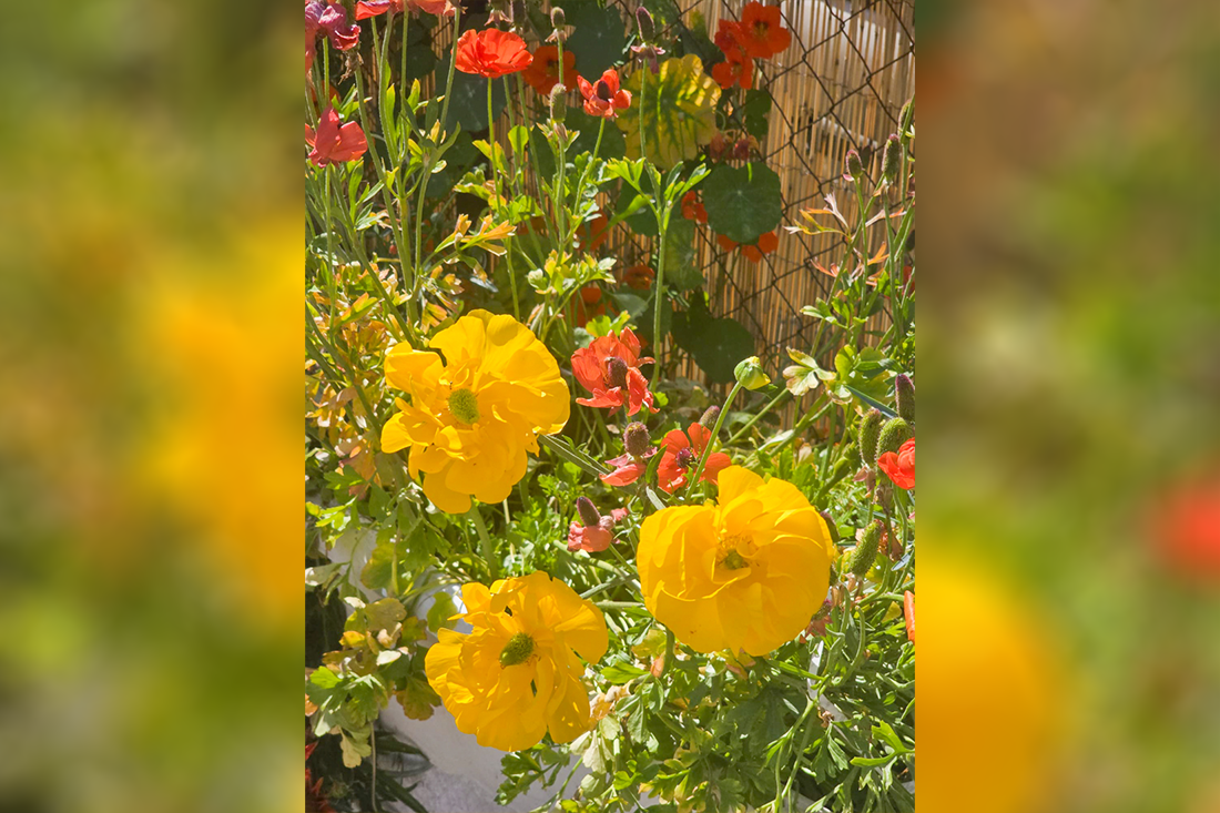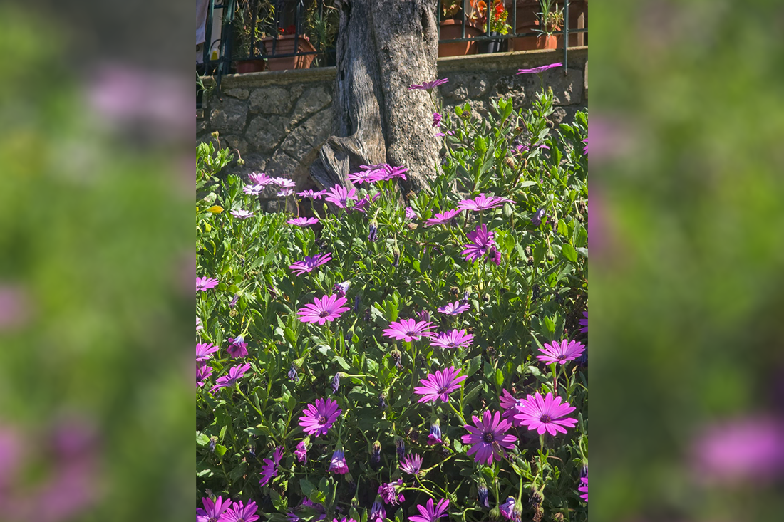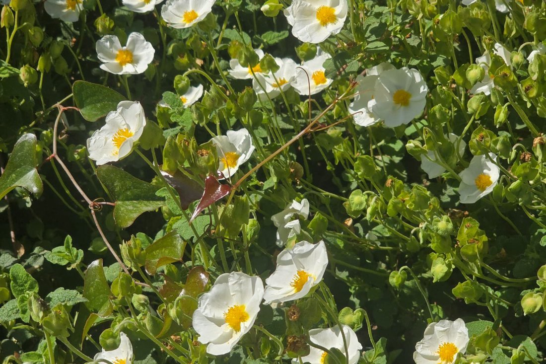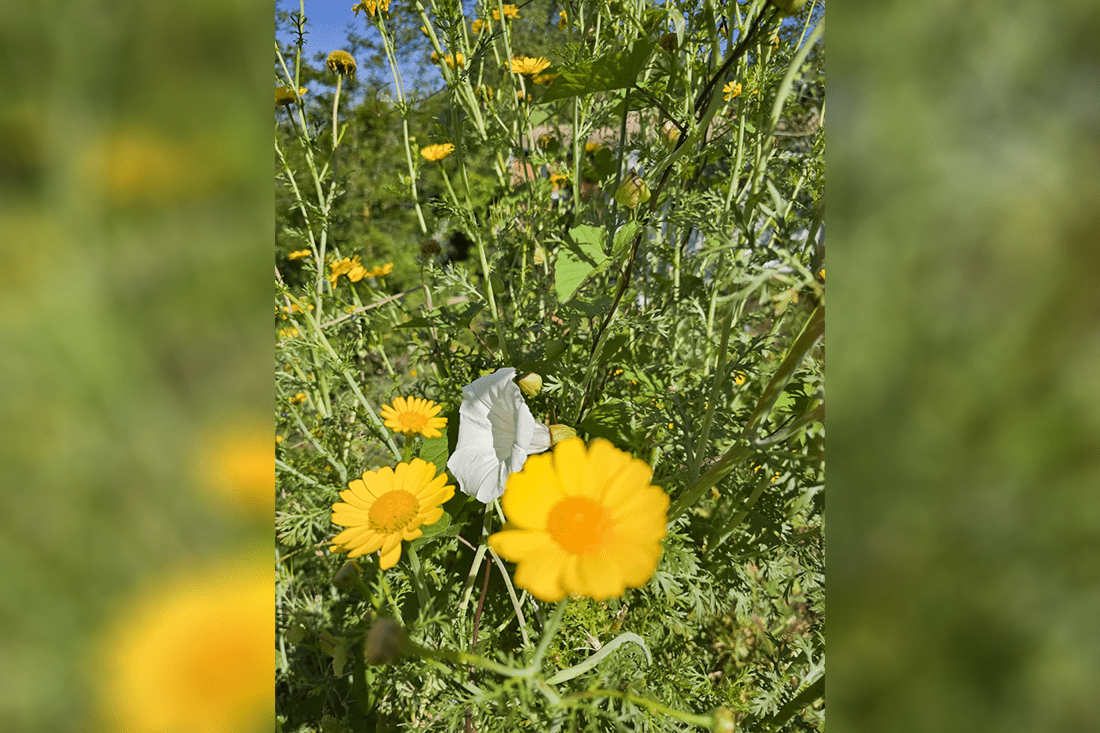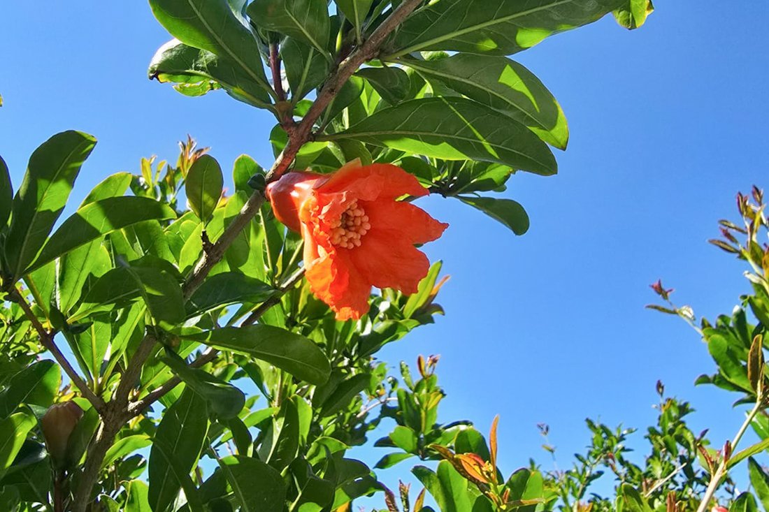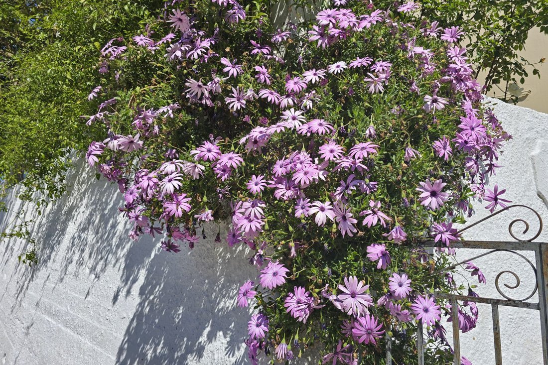 Al snel werd ik omringd door bloemen. Ik zag margrietjes in alle kleuren. In de berm stond een heel veldje met kamilleplanten en het rook heerlijk. Overal waar ik keek, zag ik bloemen. Na een tijdje kwam ik langs een roda, granaatappel, in bloei en ook mousmoula, mispels, kwamen op mijn pad. Samen met de vlinders en bijen genoot ik van deze lentepracht. Een kenner ben ik niet maar een app op mijn telefoon hielp me af en toe met identificeren.