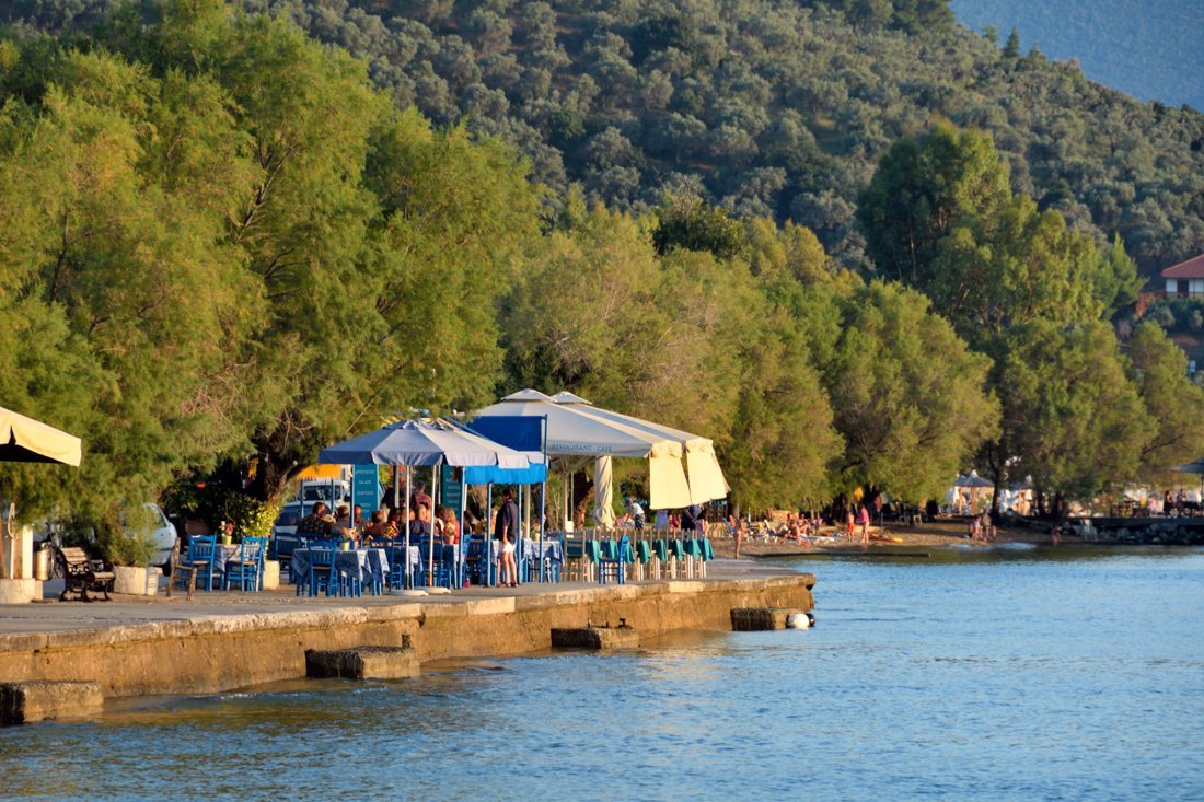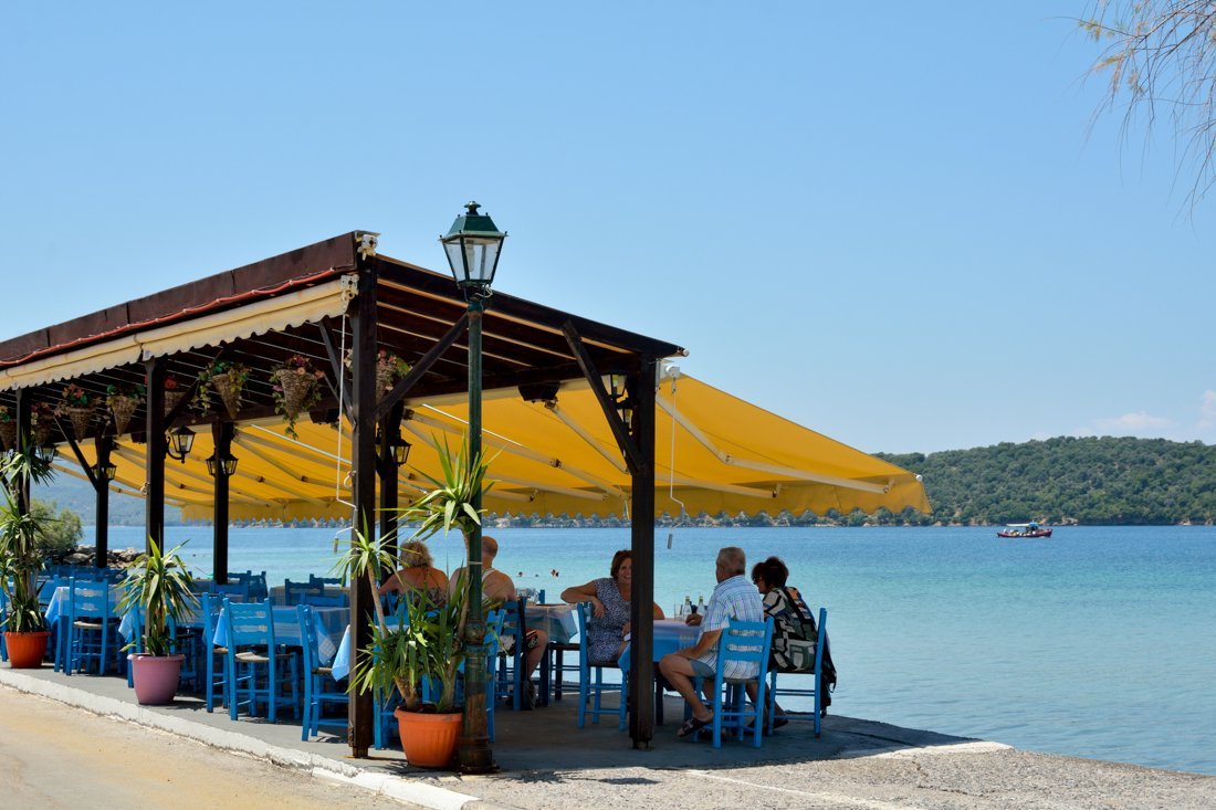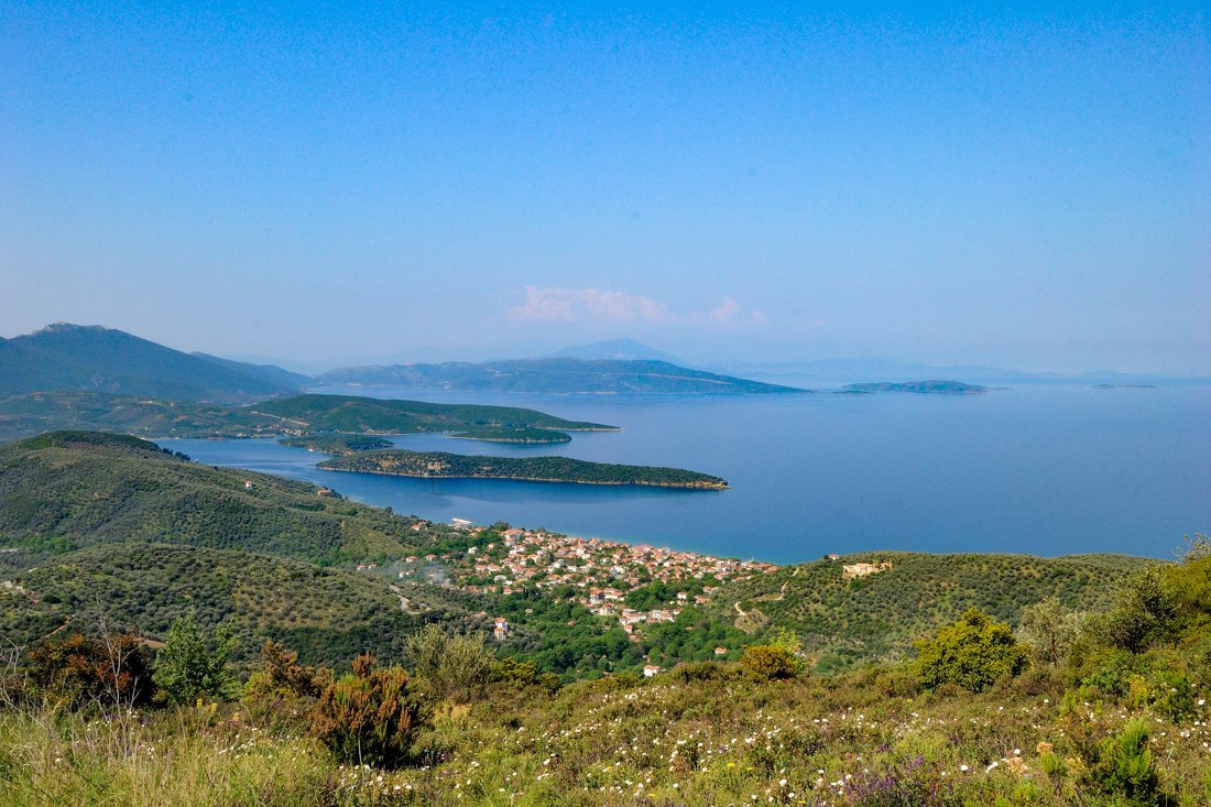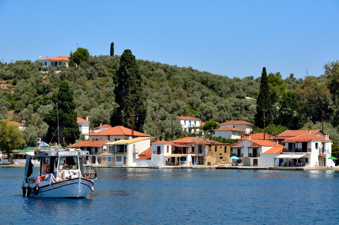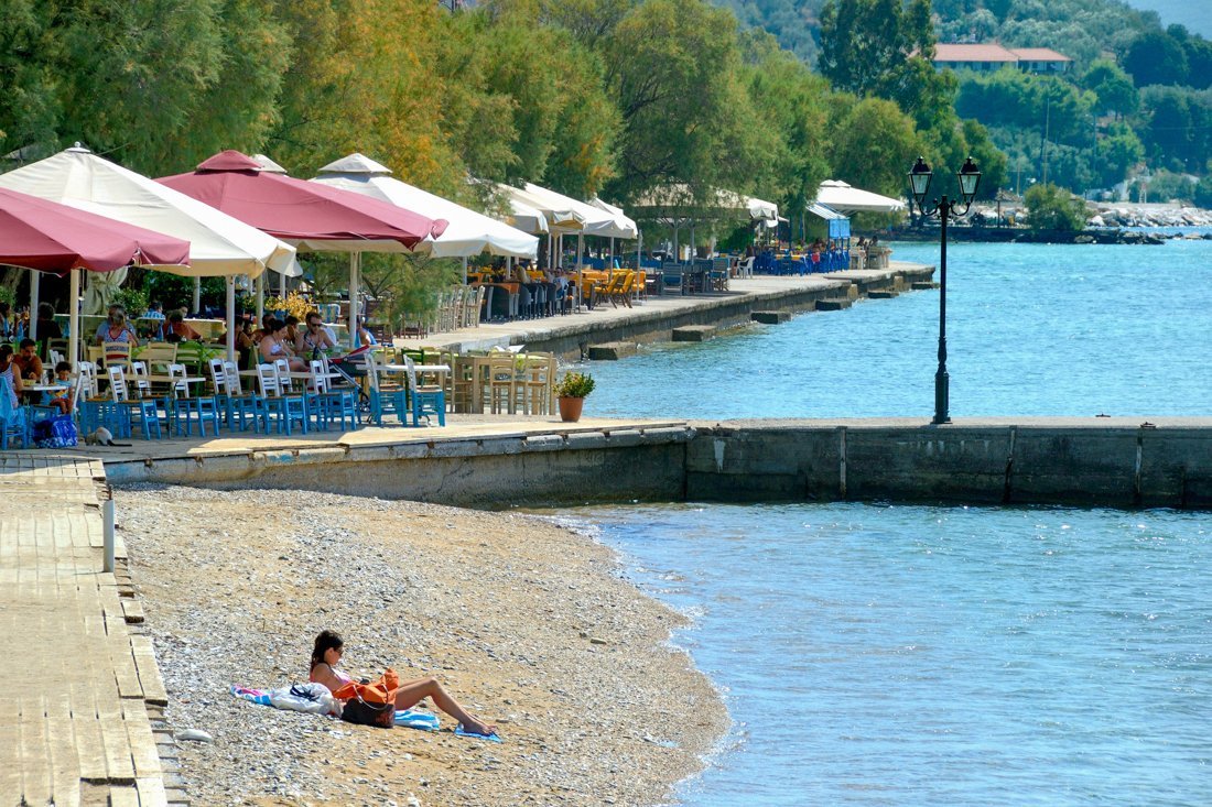 Nu rijden we weer richting de kust. U staat hier versteld van de fraaie uitzichten die achter iedere bocht schuilgaan. U zult steeds willen stoppen om een foto te maken. Maar er komen zoveel mooie punten; het is een aaneenschakeling van de groen begroeide hellingen die overlopen in de blauwe zee. U volgt de bochtige kustlijn en dan verschijnt een idyllisch plekje in het oog: Tzasteni. Ooit was het een klooster, maar hoe het nu in gebruik is, laat zich wat raden. Het bijbehorende strandje is via een voetpad te bereiken. Ondanks dat ik hier wel de hele middag zou willen blijven om te luisteren naar de stilte, het kabbelende water en de warmte op mijn gezicht, besluit ik toch om door te rijden. Lunchtijd is namelijk gepland in Trikeri. Slechts enkele tavernes, direct aan het water gelegen, en bij mooi weer een geliefde plaats voor de Grieken om verse vis te eten. Zo uit zee, schoongemaakt, gegrild en op uw bord. Hoe vers wilt u het hebben? Na genoten te hebben van de inktvis, de vis en de verse garnalen laat onze volle buik het haast niet toe, maar nu we er toch zijn, willen we ook even met de boottaxi naar het eiland Trikeri. Even een wandeling tot aan het klooster, waar we de laatst wonende non tegenkwamen. Met moeite konden we haar verleiden tot een praatje. Zij heeft genoeg aan haar eigen leven in het klooster. Ook hier in de haven bevinden zich enkele goede tavernes, maar onze magen lieten het ons niet toe ook hier wat te gebruiken. Terug met de boottaxi naar het vasteland van Pilion. Even lekker de haren in de wind!