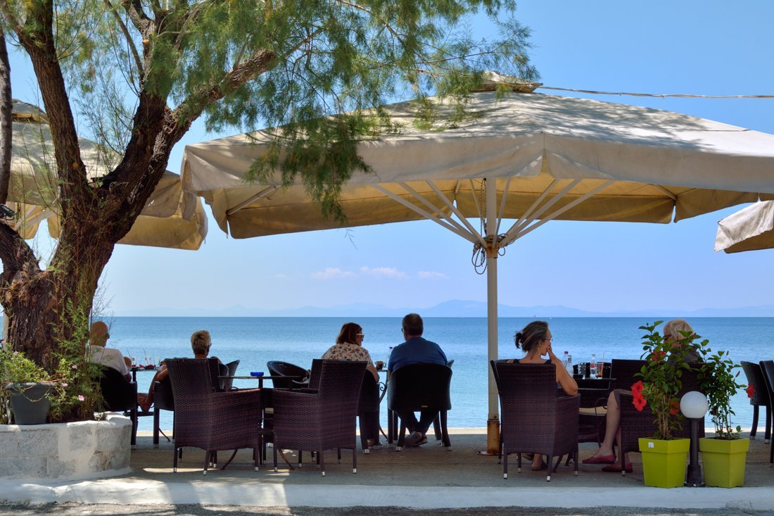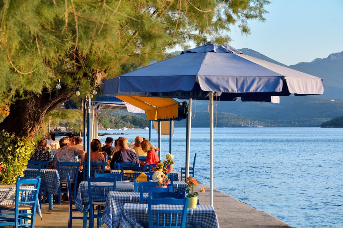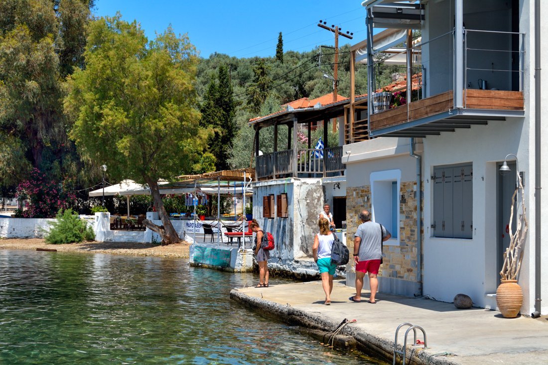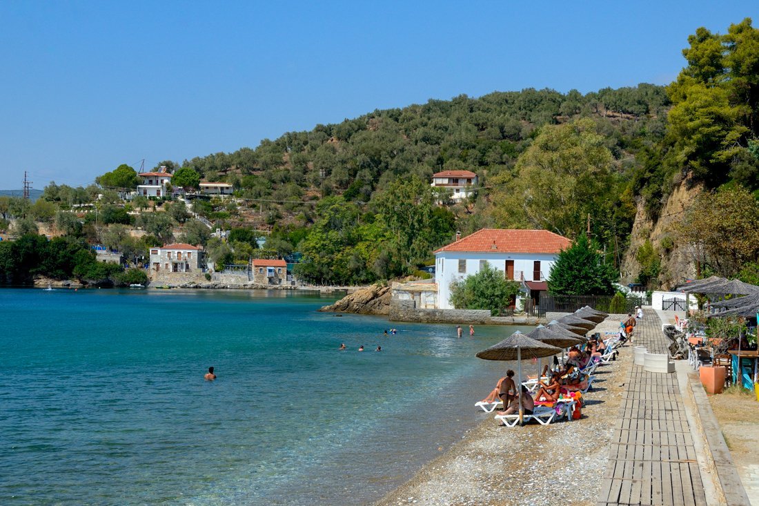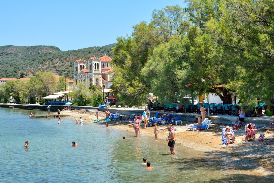 Nu rijden we weer richting de kust. U staat hier versteld van de fraaie uitzichten die achter iedere bocht schuilgaan. U zult steeds willen stoppen om een foto te maken. Maar er komen zoveel mooie punten; het is een aaneenschakeling van de groen begroeide hellingen die overlopen in de blauwe zee. U volgt de bochtige kustlijn en dan verschijnt een idyllisch plekje in het oog: Tzasteni. Ooit was het een klooster, maar hoe het nu in gebruik is, laat zich wat raden. Het bijbehorende strandje is via een voetpad te bereiken. Ondanks dat ik hier wel de hele middag zou willen blijven om te luisteren naar de stilte, het kabbelende water en de warmte op mijn gezicht, besluit ik toch om door te rijden. Lunchtijd is namelijk gepland in Trikeri. Slechts enkele tavernes, direct aan het water gelegen, en bij mooi weer een geliefde plaats voor de Grieken om verse vis te eten. Zo uit zee, schoongemaakt, gegrild en op uw bord. Hoe vers wilt u het hebben? Na genoten te hebben van de inktvis, de vis en de verse garnalen laat onze volle buik het haast niet toe, maar nu we er toch zijn, willen we ook even met de boottaxi naar het eiland Trikeri. Even een wandeling tot aan het klooster, waar we de laatst wonende non tegenkwamen. Met moeite konden we haar verleiden tot een praatje. Zij heeft genoeg aan haar eigen leven in het klooster. Ook hier in de haven bevinden zich enkele goede tavernes, maar onze magen lieten het ons niet toe ook hier wat te gebruiken. Terug met de boottaxi naar het vasteland van Pilion. Even lekker de haren in de wind!